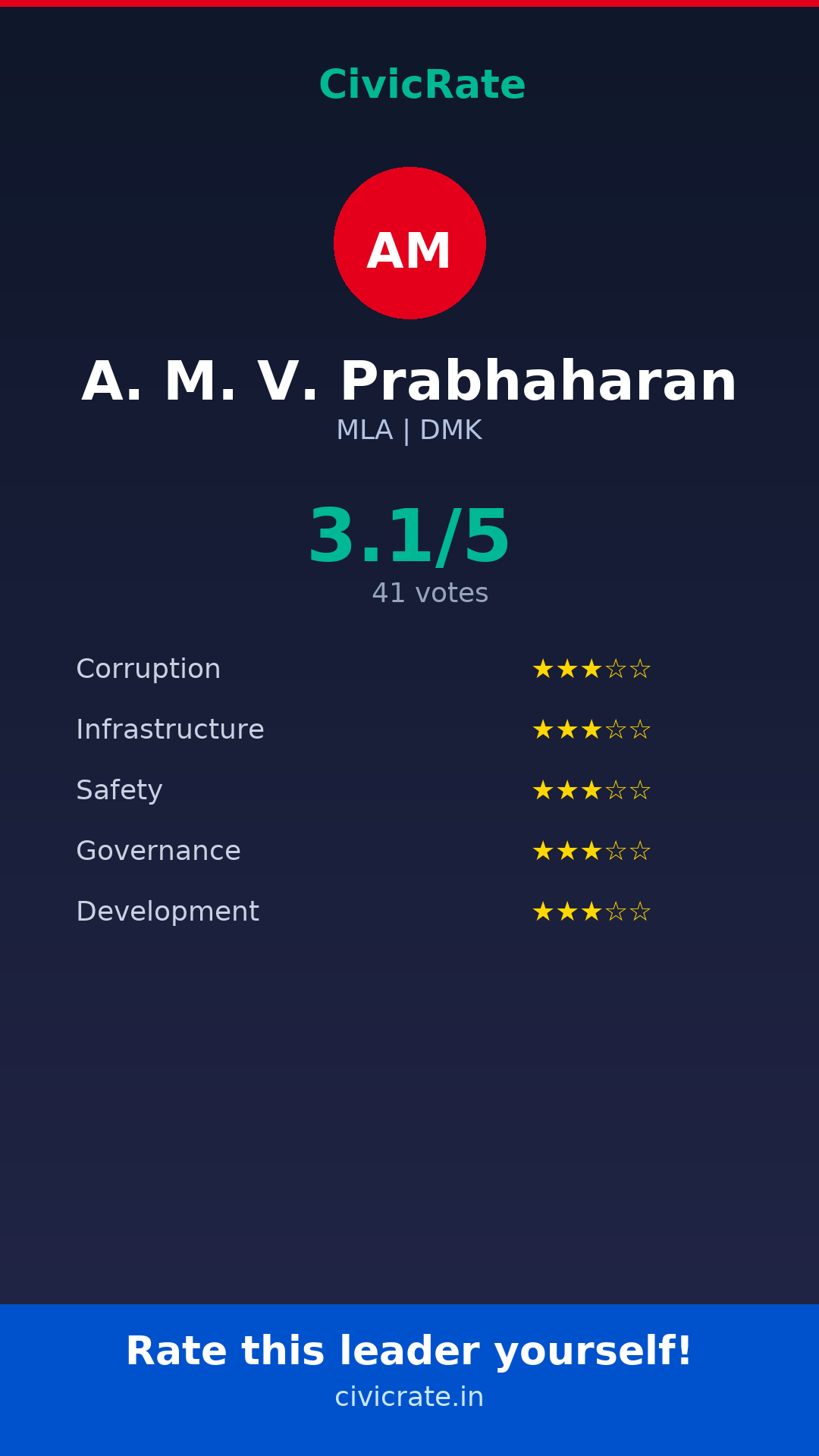 A. M. V. Prabhaharan (MLA, DMK) has an overall citizen rating (CR Score) of 3.1/5 based on 41 anonymous votes on CivicRate. The score covers 5 parameters: Corruption Perception, Infrastructure, Safety, Governance, and Development.