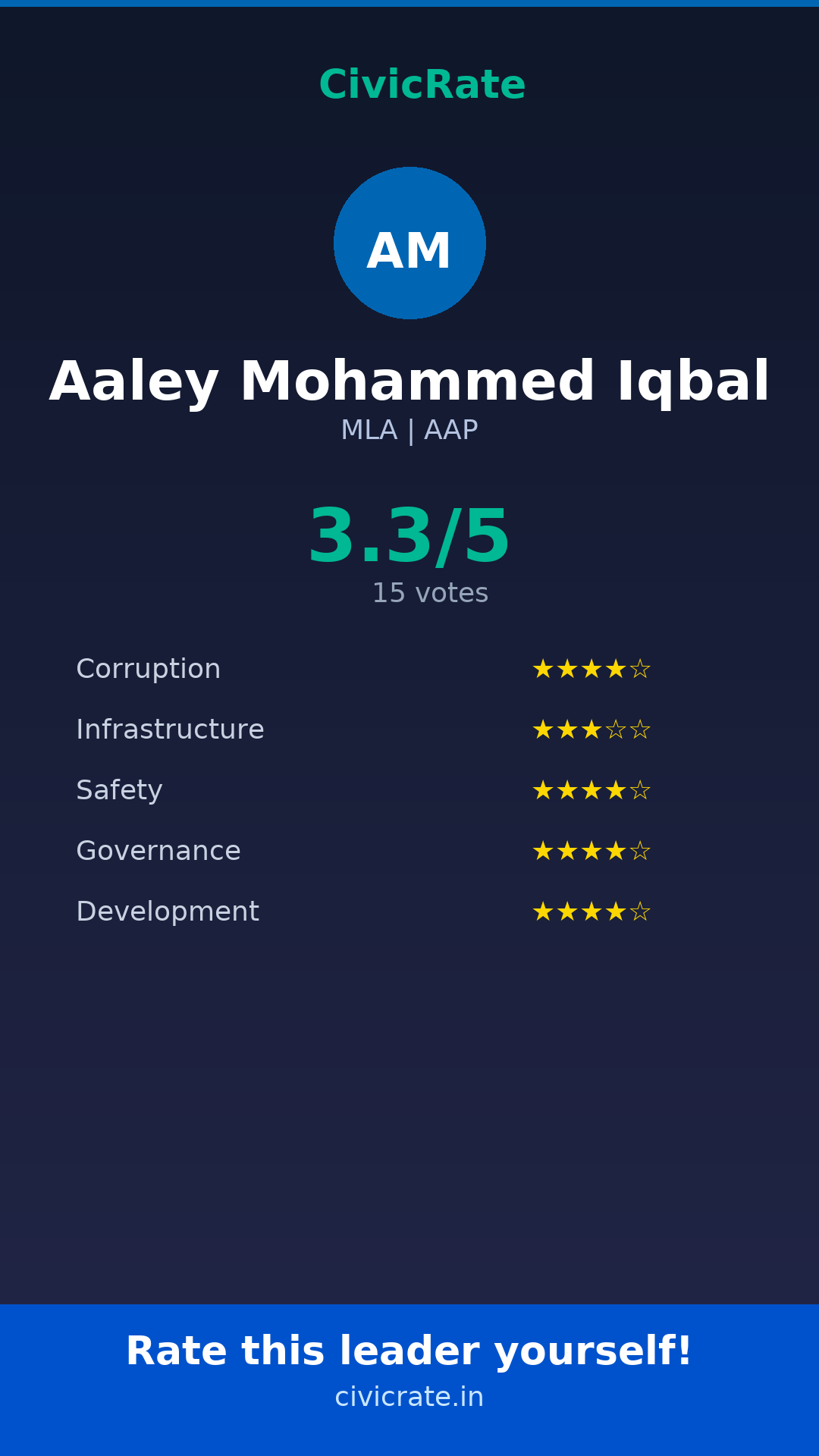 Aaley Mohammed Iqbal (MLA, AAP) has an overall citizen rating (CR Score) of 3.3/5 based on 15 anonymous votes on CivicRate. The score covers 5 parameters: Corruption Perception, Infrastructure, Safety, Governance, and Development.