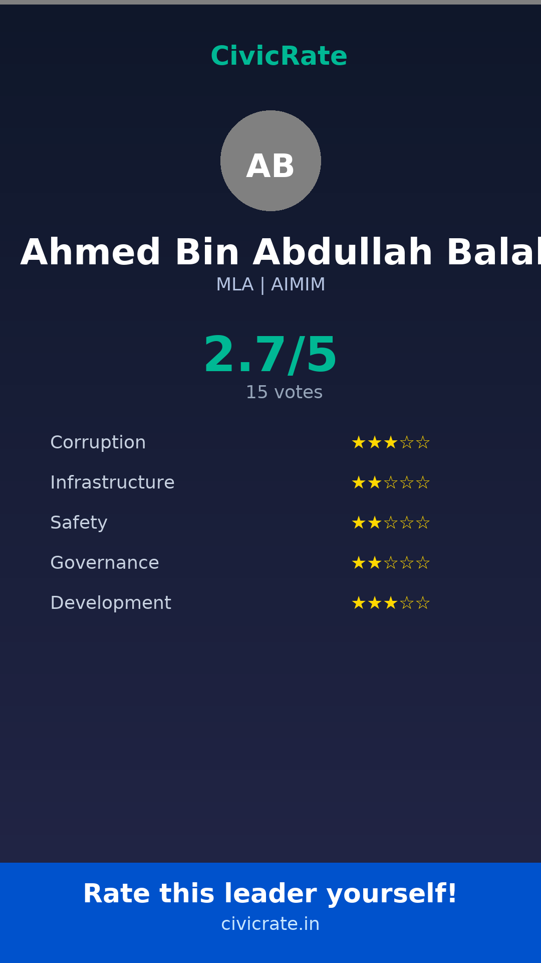 Ahmed Bin Abdullah Balala (MLA, AIMIM) has an overall citizen rating (CR Score) of 2.7/5 based on 15 anonymous votes on CivicRate. The score covers 5 parameters: Corruption Perception, Infrastructure, Safety, Governance, and Development.