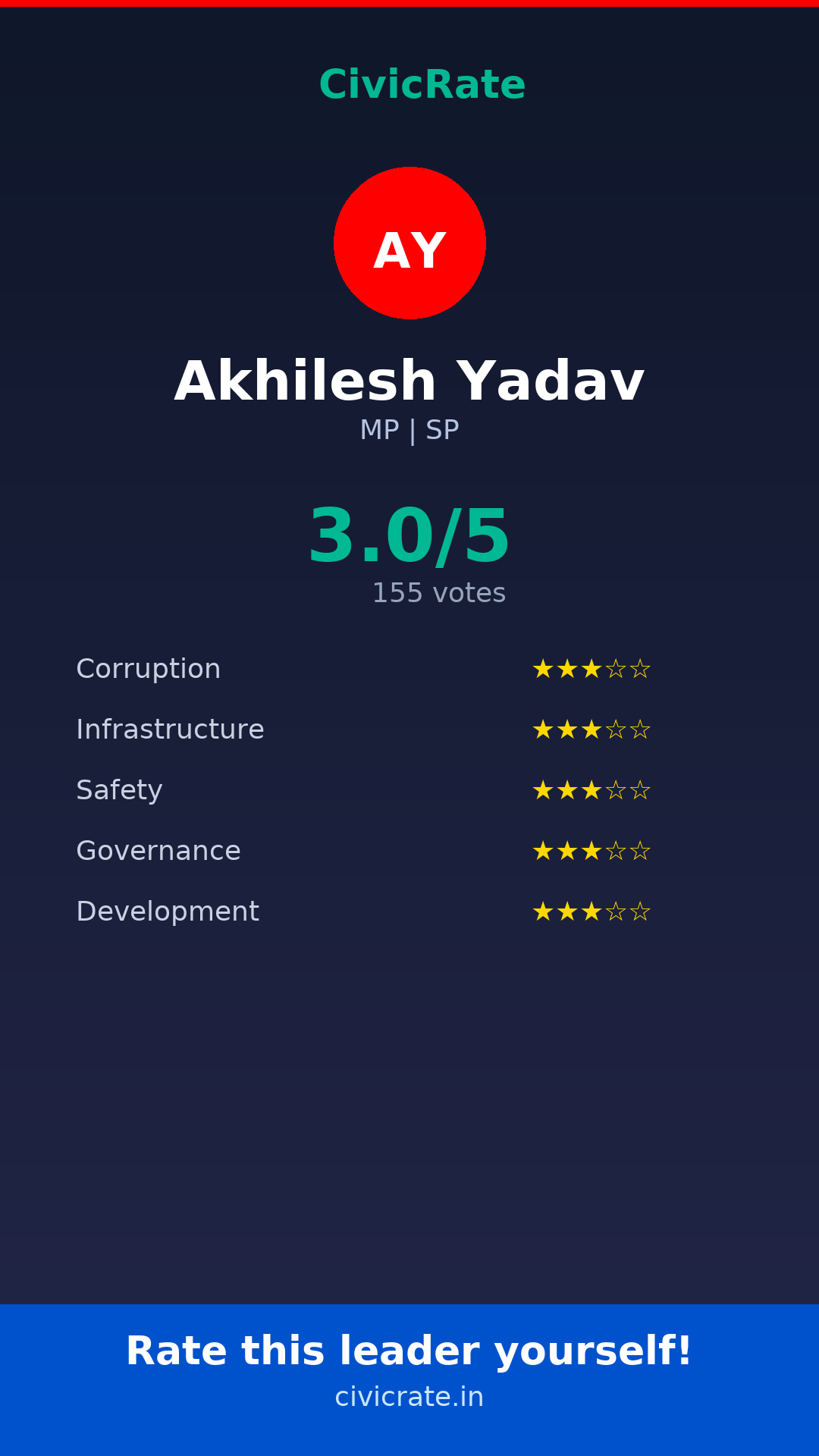 Visit civicrate.in/rate/akhilesh-yadav to rate Akhilesh Yadav on 5 parameters: Corruption, Infrastructure, Safety, Governance, and Development. All ratings are 100% anonymous and verified via phone OTP.