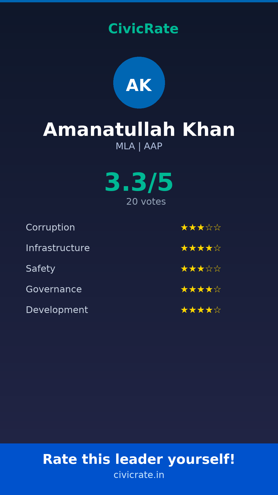 Visit civicrate.in/rate/amanatullah-khan to rate Amanatullah Khan on 5 parameters: Corruption, Infrastructure, Safety, Governance, and Development. All ratings are 100% anonymous and verified via phone OTP.