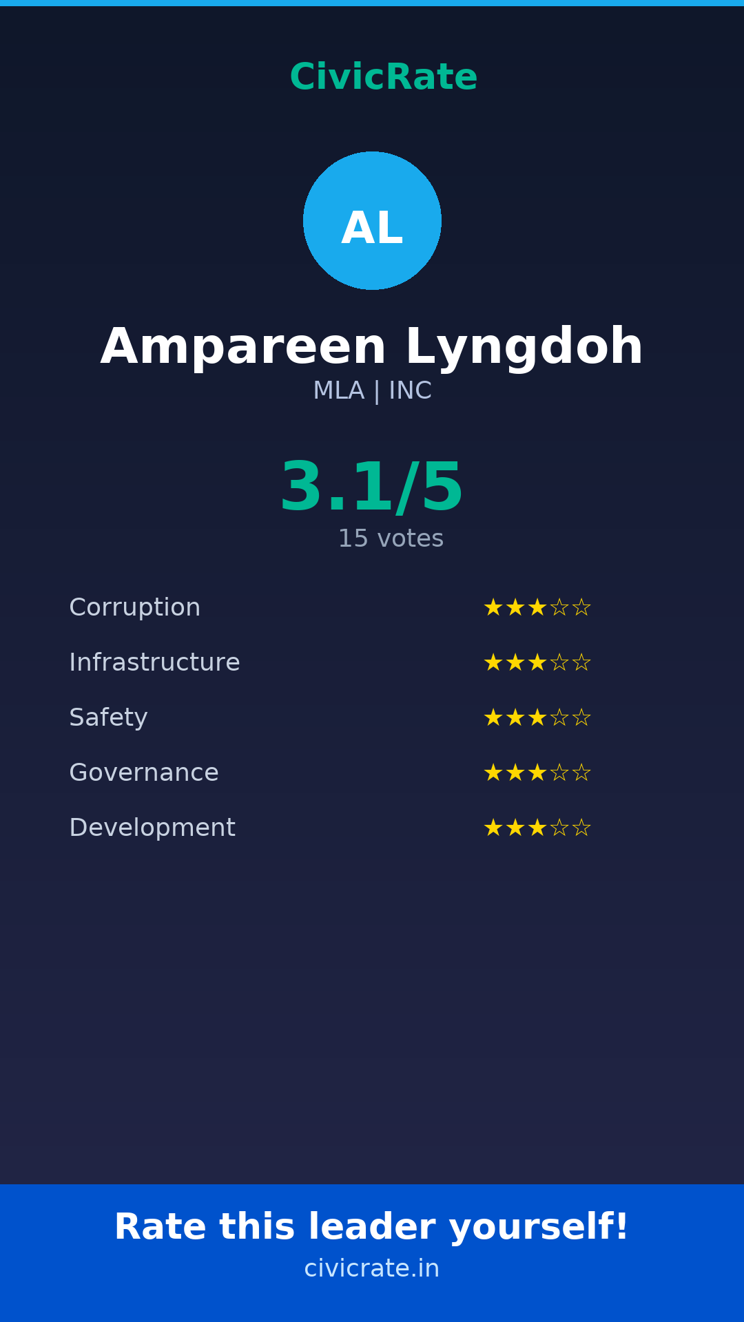 Visit civicrate.in/rate/ampareen-lyngdoh to rate Ampareen Lyngdoh on 5 parameters: Corruption, Infrastructure, Safety, Governance, and Development. All ratings are 100% anonymous and verified via phone OTP.