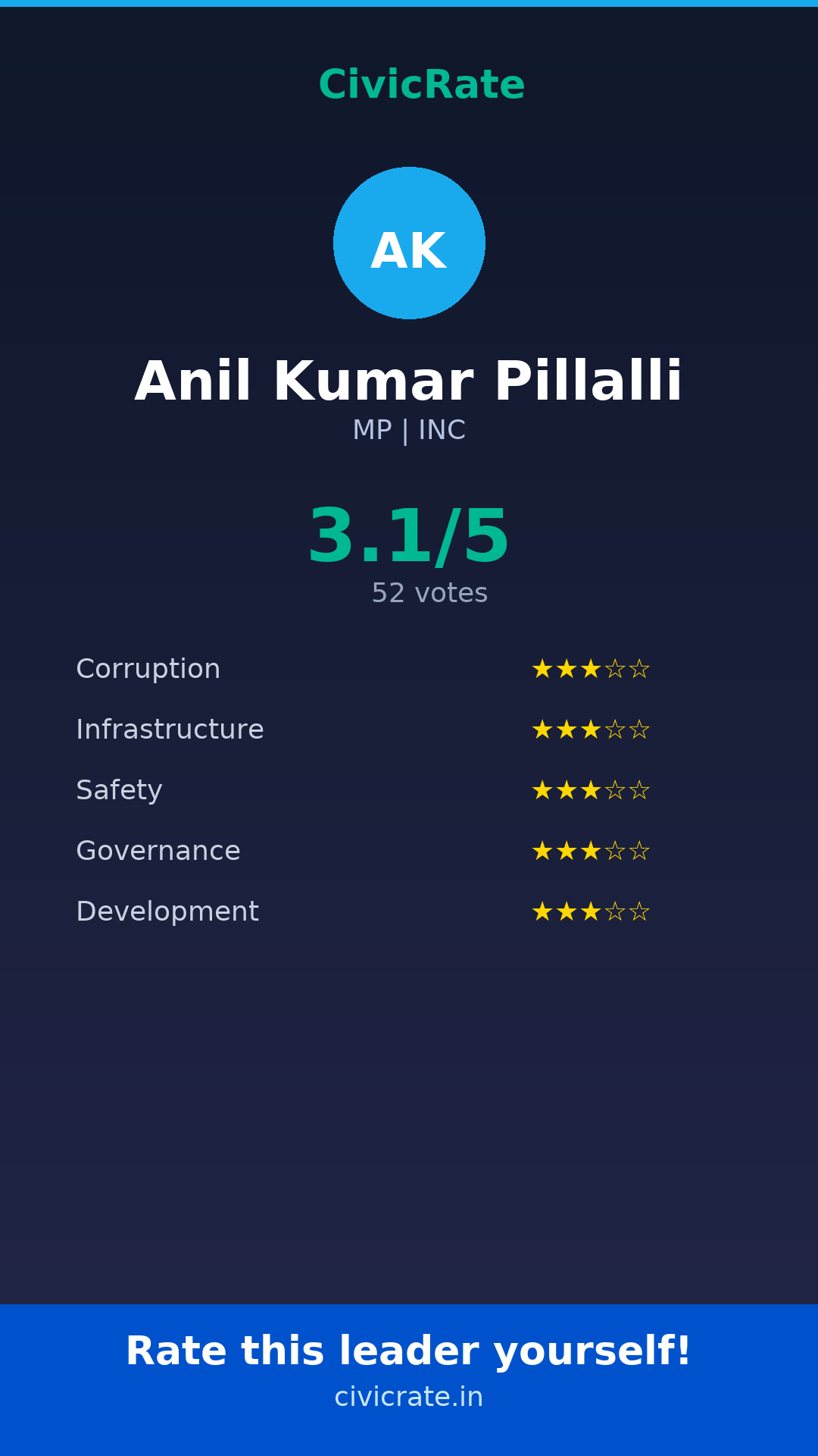 Anil Kumar Pillalli (MP, INC) has an overall citizen rating (CR Score) of 3.1/5 based on 52 anonymous votes on CivicRate. The score covers 5 parameters: Corruption Perception, Infrastructure, Safety, Governance, and Development.