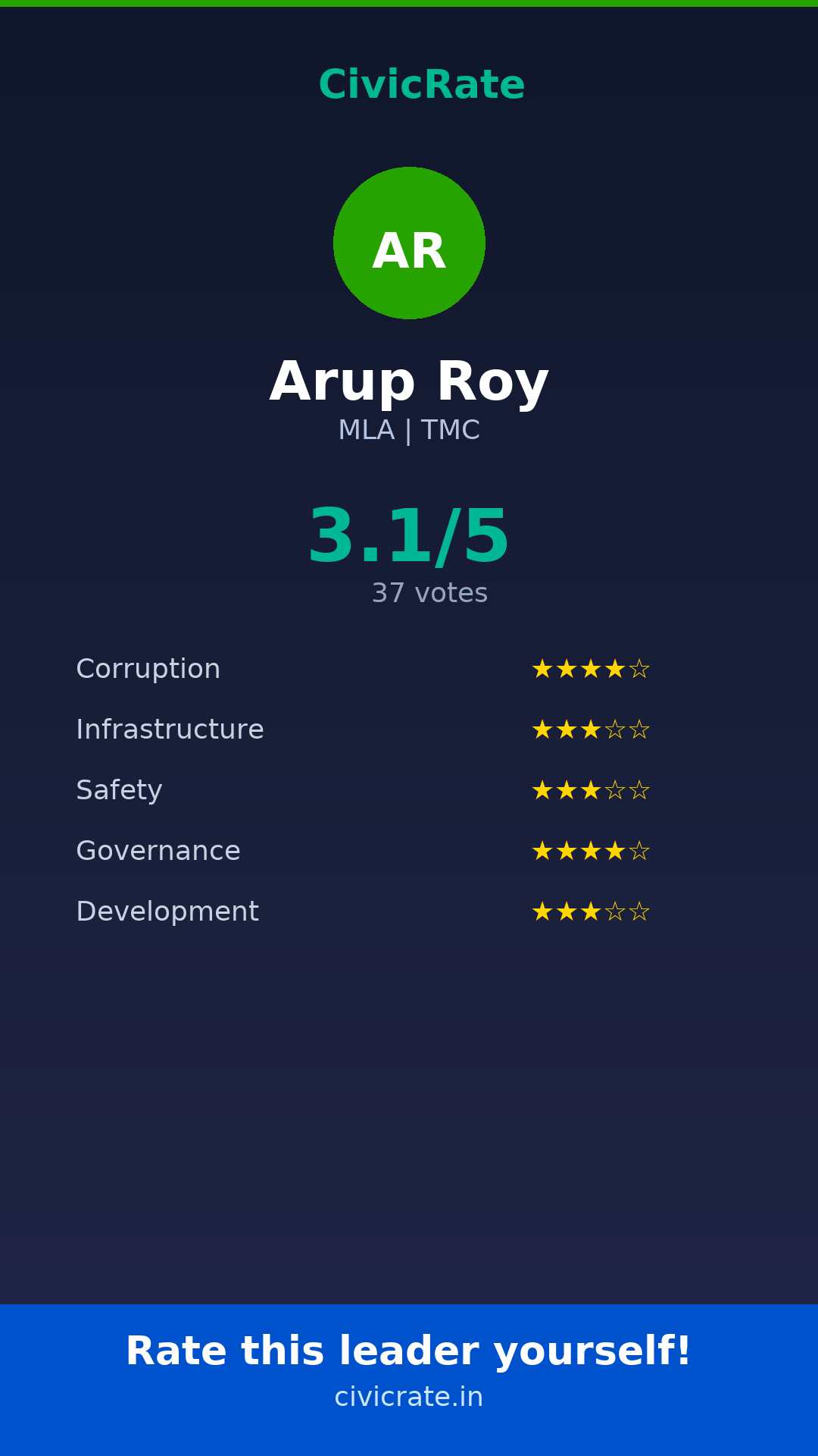 Arup Roy (MLA, TMC) has an overall citizen rating (CR Score) of 3.1/5 based on 37 anonymous votes on CivicRate. The score covers 5 parameters: Corruption Perception, Infrastructure, Safety, Governance, and Development.