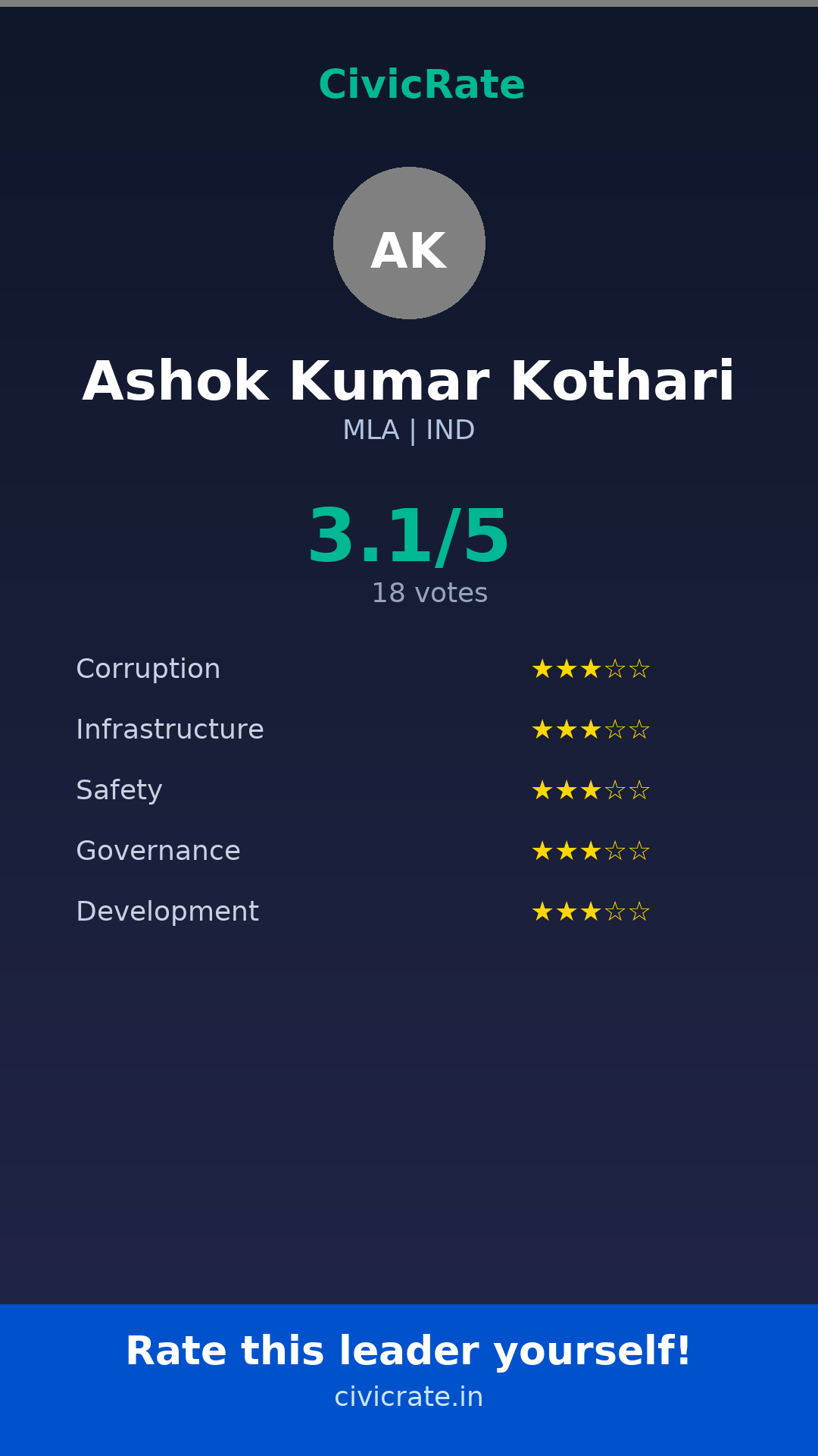 Visit civicrate.in/rate/ashok-kumar-kothari to rate Ashok Kumar Kothari on 5 parameters: Corruption, Infrastructure, Safety, Governance, and Development. All ratings are 100% anonymous and verified via phone OTP.
