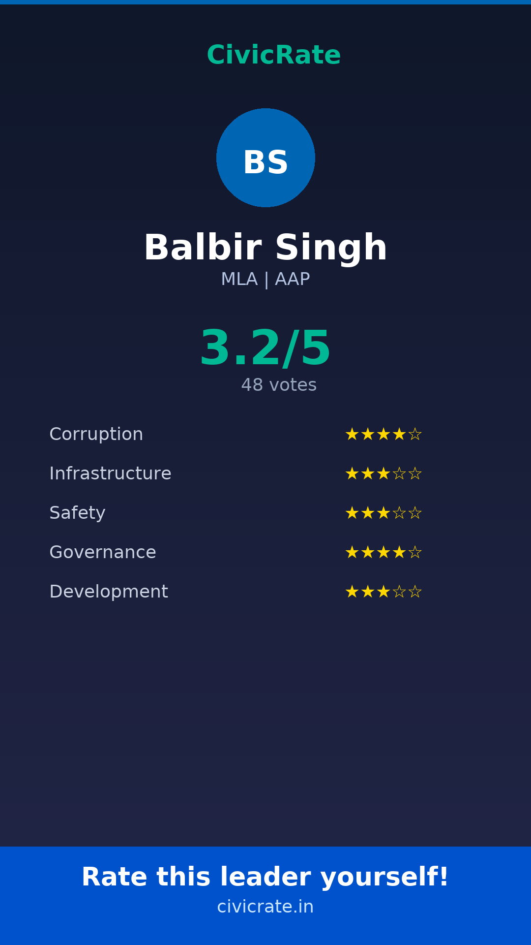 Balbir Singh (MLA, AAP) has an overall citizen rating (CR Score) of 3.2/5 based on 48 anonymous votes on CivicRate. The score covers 5 parameters: Corruption Perception, Infrastructure, Safety, Governance, and Development.