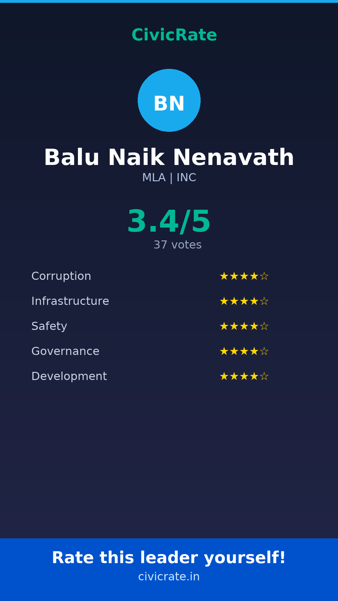 Balu Naik Nenavath (MLA, INC) has an overall citizen rating (CR Score) of 3.4/5 based on 37 anonymous votes on CivicRate. The score covers 5 parameters: Corruption Perception, Infrastructure, Safety, Governance, and Development.