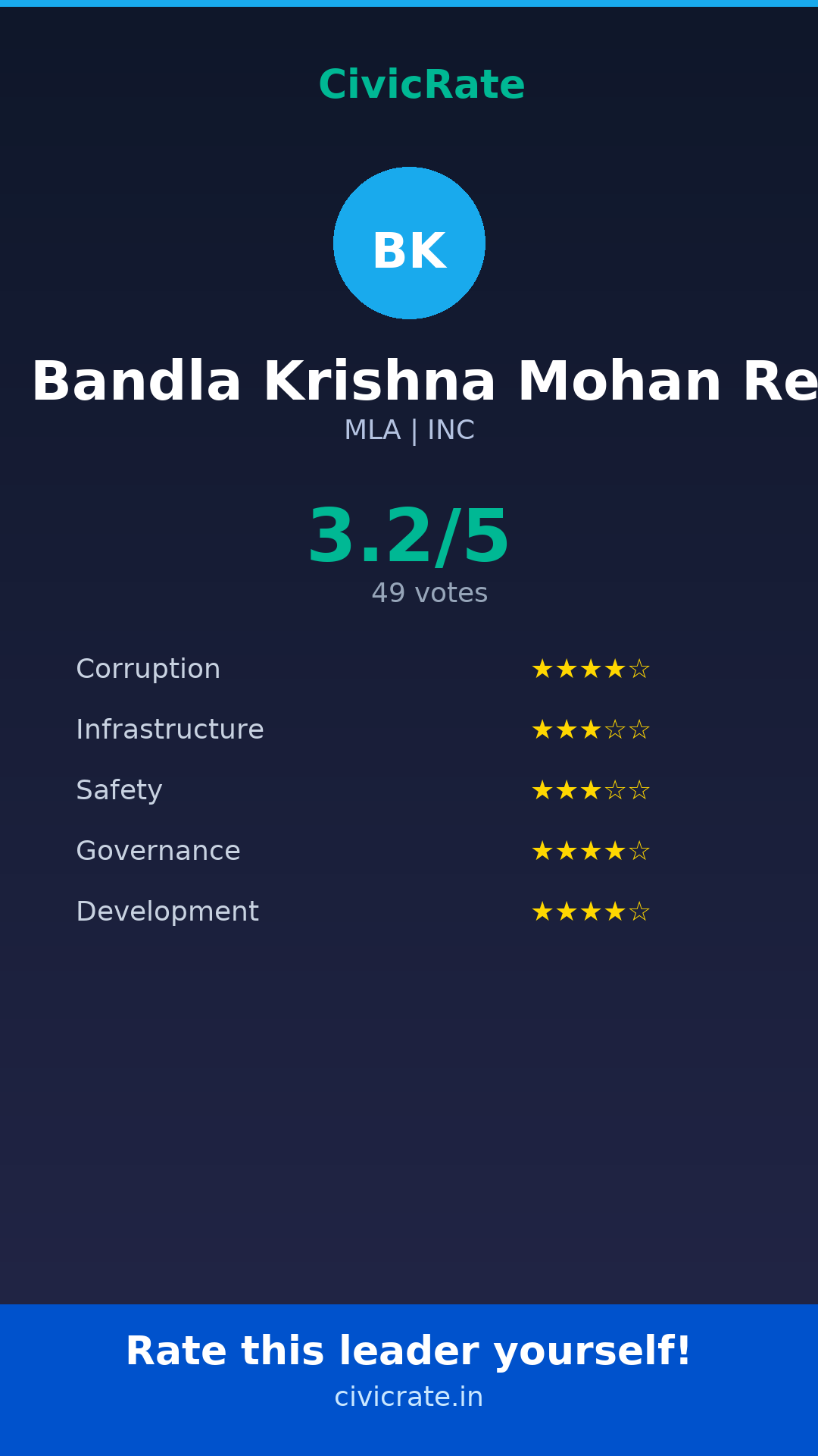 Bandla Krishna Mohan Reddy (MLA, INC) has an overall citizen rating (CR Score) of 3.2/5 based on 49 anonymous votes on CivicRate. The score covers 5 parameters: Corruption Perception, Infrastructure, Safety, Governance, and Development.