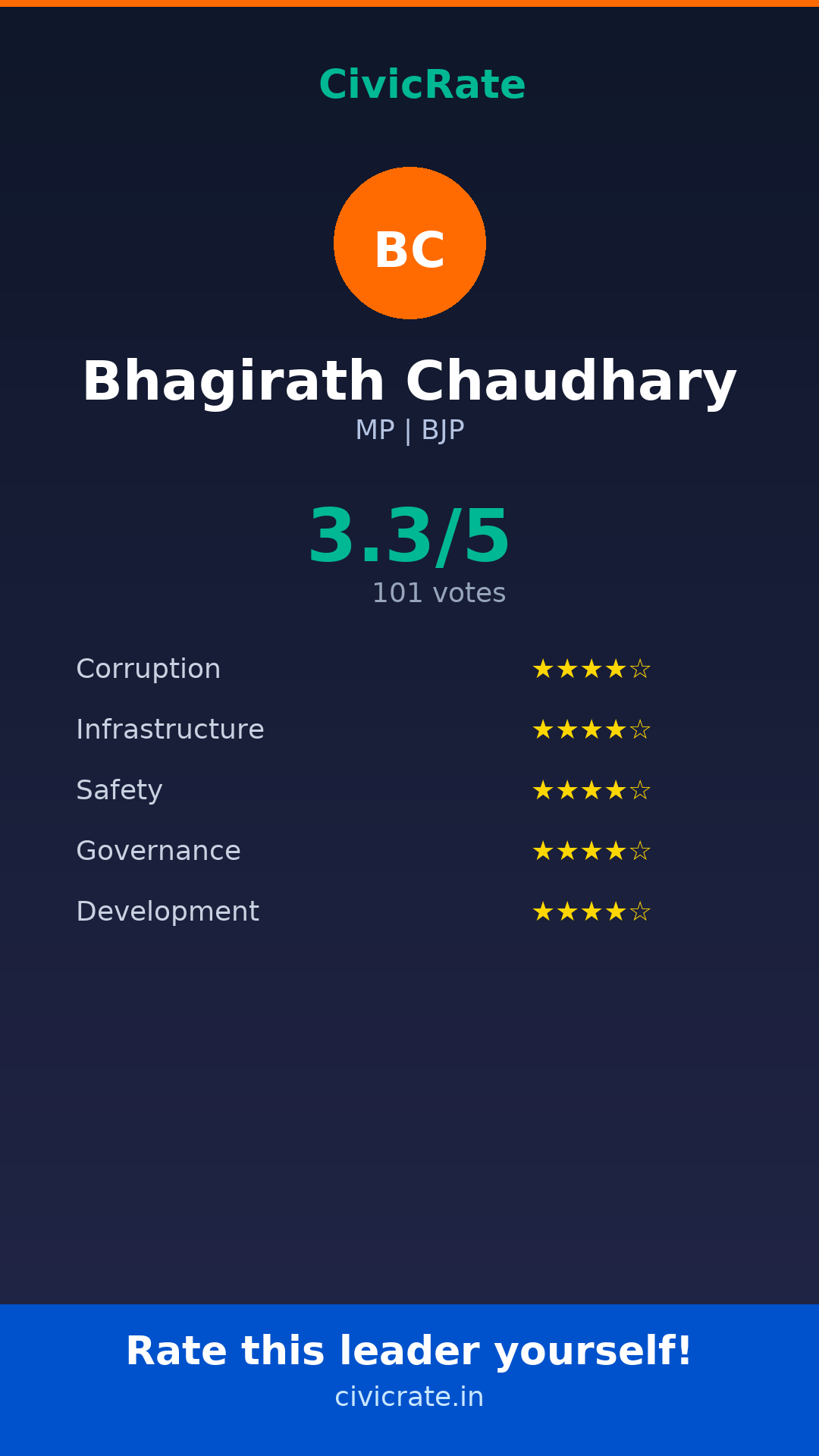 Bhagirath Chaudhary (MP, BJP) has an overall citizen rating (CR Score) of 3.3/5 based on 101 anonymous votes on CivicRate. The score covers 5 parameters: Corruption Perception, Infrastructure, Safety, Governance, and Development.