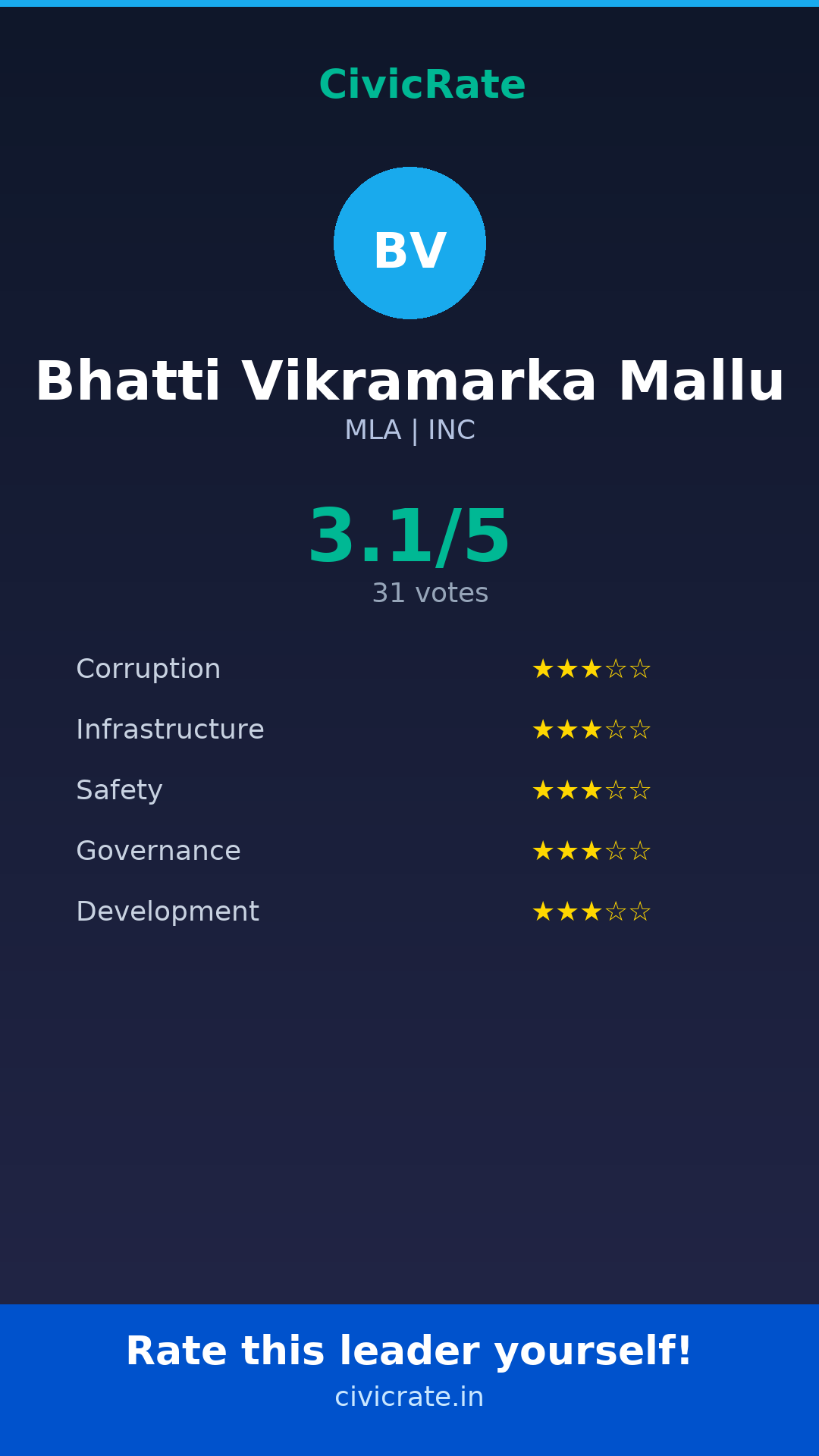 Bhatti Vikramarka Mallu (MLA, INC) has an overall citizen rating (CR Score) of 3.1/5 based on 31 anonymous votes on CivicRate. The score covers 5 parameters: Corruption Perception, Infrastructure, Safety, Governance, and Development.
