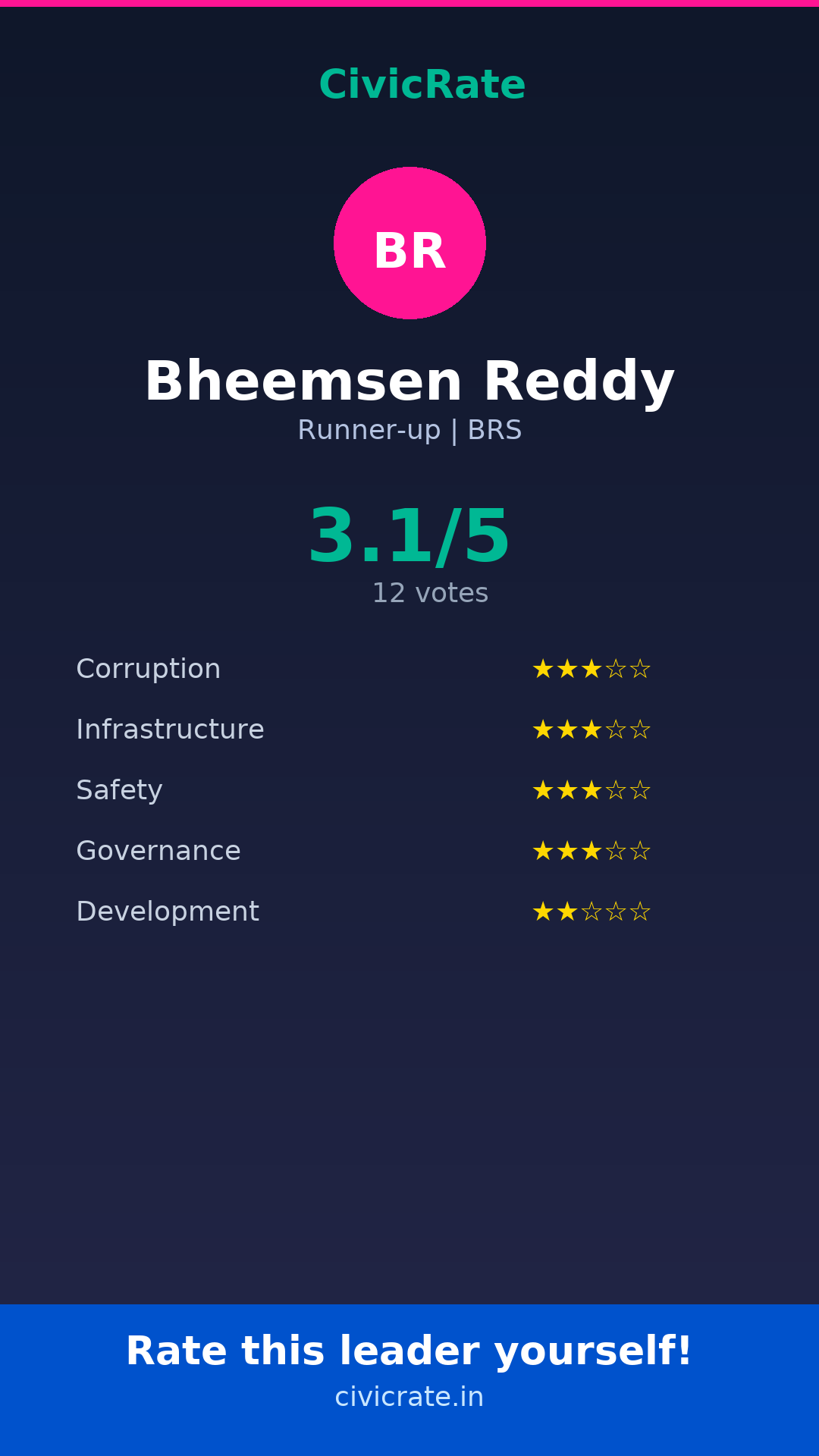 Bheemsen Reddy (Runner-up, BRS) has an overall citizen rating (CR Score) of 3.1/5 based on 12 anonymous votes on CivicRate. The score covers 5 parameters: Corruption Perception, Infrastructure, Safety, Governance, and Development.
