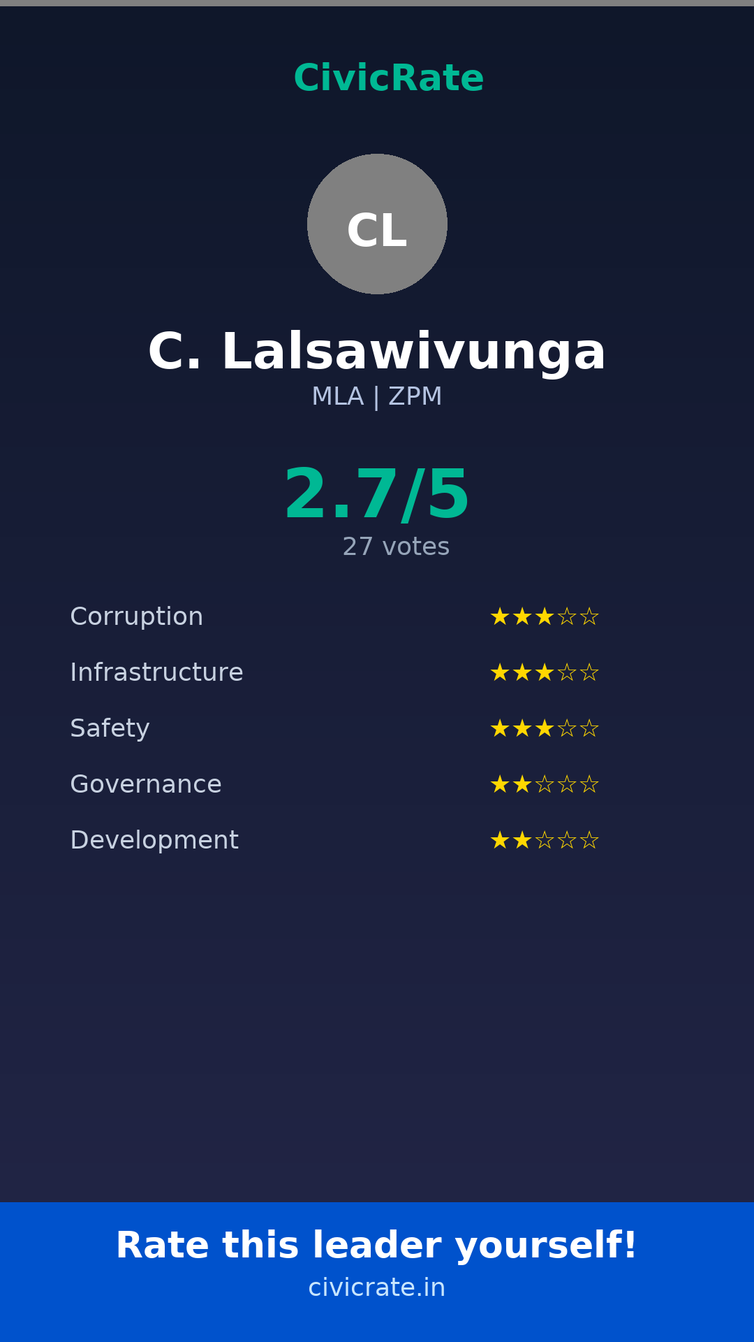 C. Lalsawivunga (MLA, ZPM) has an overall citizen rating (CR Score) of 2.7/5 based on 27 anonymous votes on CivicRate. The score covers 5 parameters: Corruption Perception, Infrastructure, Safety, Governance, and Development.