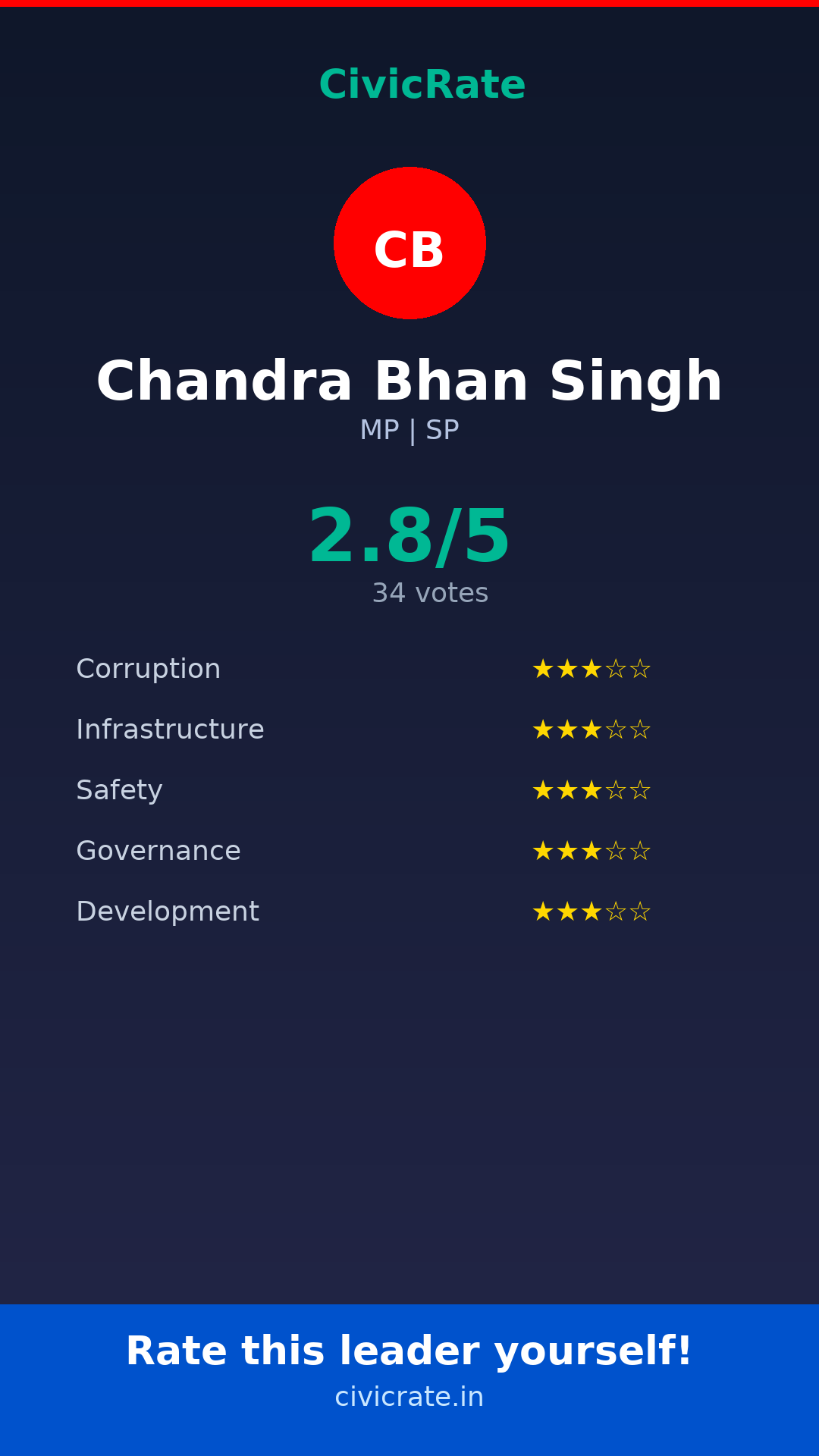 Chandra Bhan Singh (MP, SP) has an overall citizen rating (CR Score) of 2.8/5 based on 34 anonymous votes on CivicRate. The score covers 5 parameters: Corruption Perception, Infrastructure, Safety, Governance, and Development.
