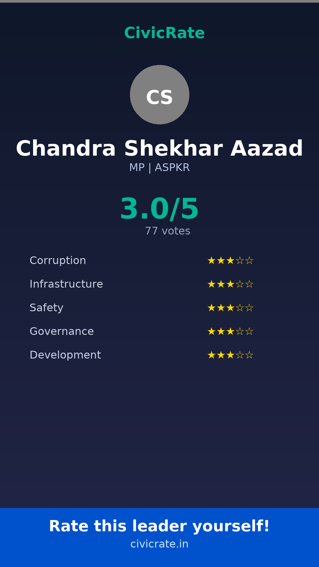 Chandra Shekhar Aazad (MP, ASPKR) has an overall citizen rating (CR Score) of 3.0/5 based on 77 anonymous votes on CivicRate. The score covers 5 parameters: Corruption Perception, Infrastructure, Safety, Governance, and Development.