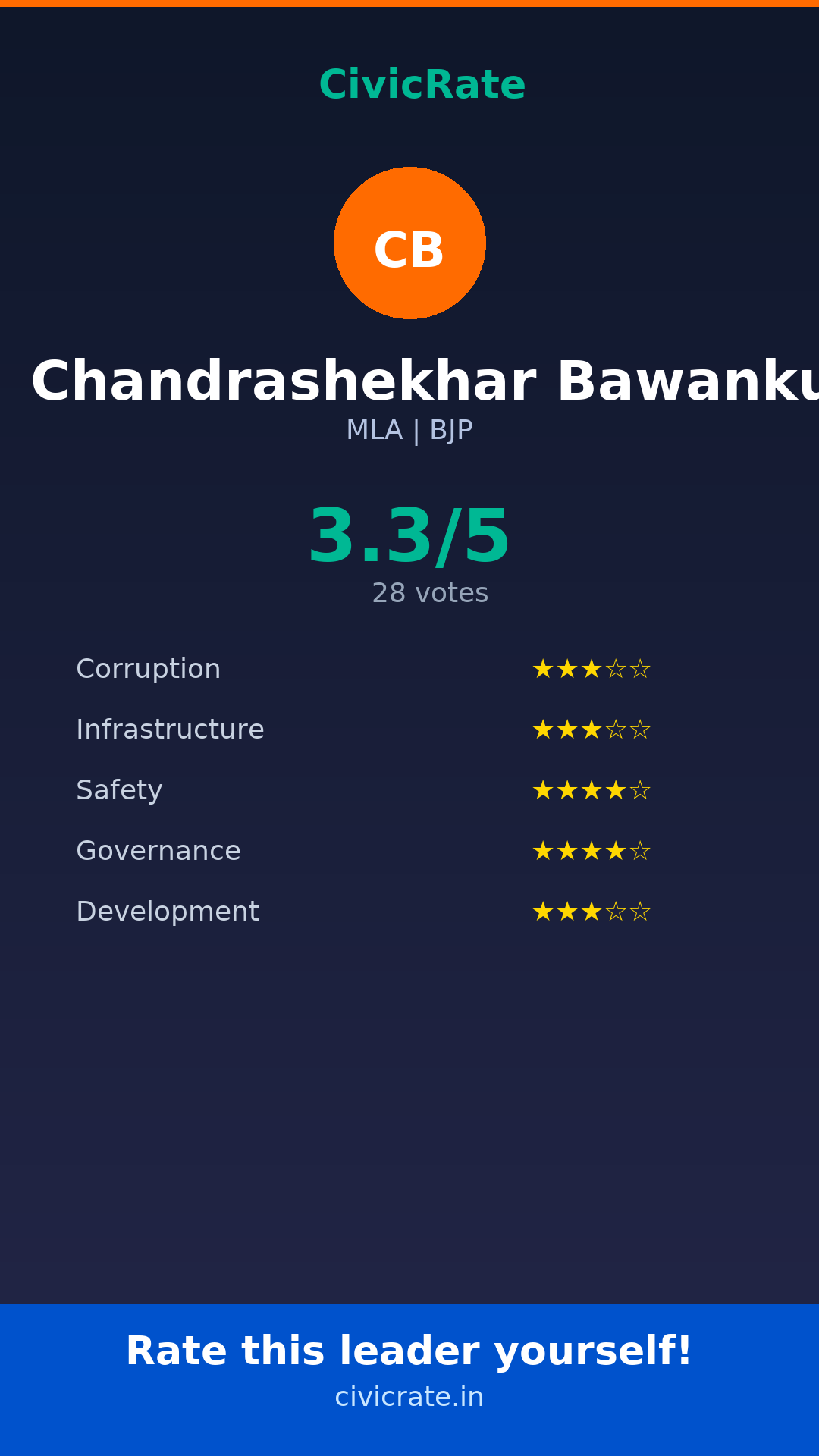 Chandrashekhar Bawankule (MLA, BJP) has an overall citizen rating (CR Score) of 3.3/5 based on 28 anonymous votes on CivicRate. The score covers 5 parameters: Corruption Perception, Infrastructure, Safety, Governance, and Development.