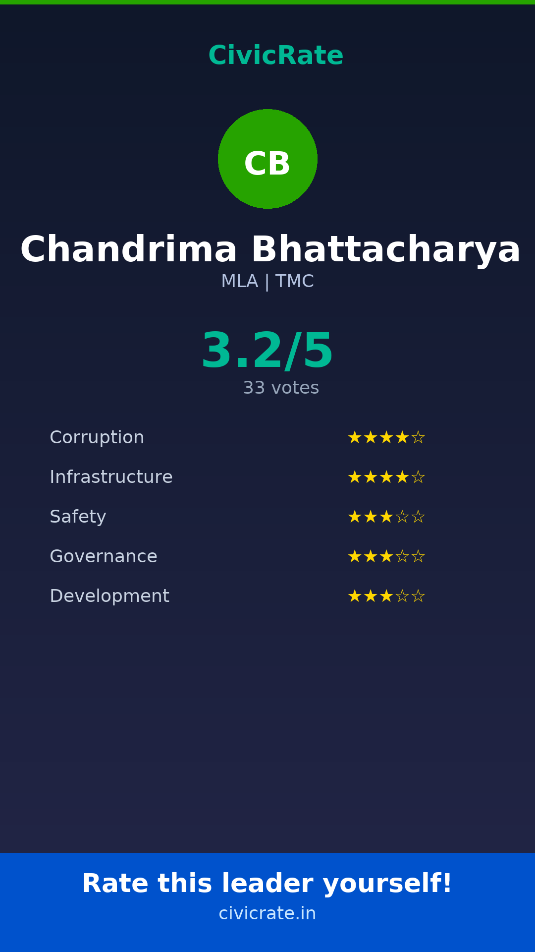 Chandrima Bhattacharya (MLA, TMC) has an overall citizen rating (CR Score) of 3.2/5 based on 33 anonymous votes on CivicRate. The score covers 5 parameters: Corruption Perception, Infrastructure, Safety, Governance, and Development.