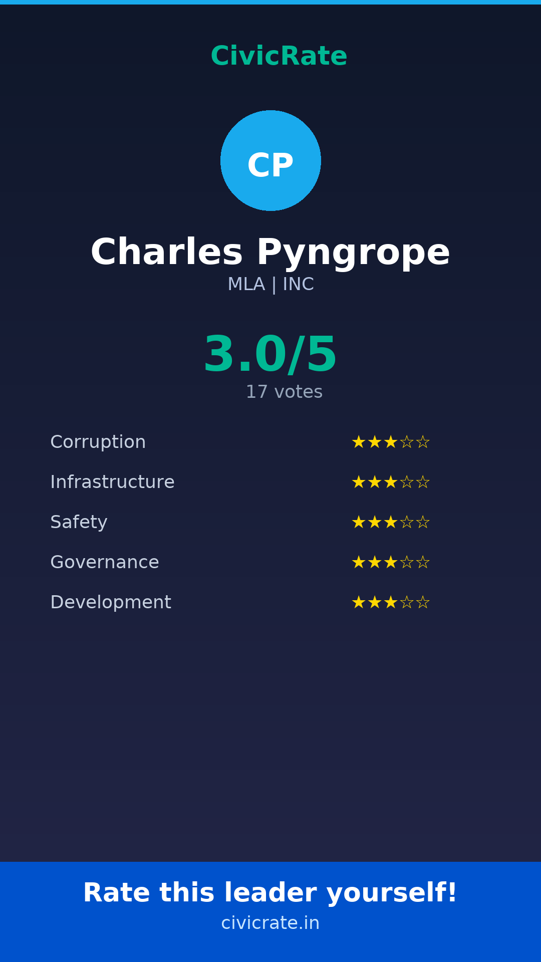Charles Pyngrope (MLA, INC) has an overall citizen rating (CR Score) of 3.0/5 based on 17 anonymous votes on CivicRate. The score covers 5 parameters: Corruption Perception, Infrastructure, Safety, Governance, and Development.