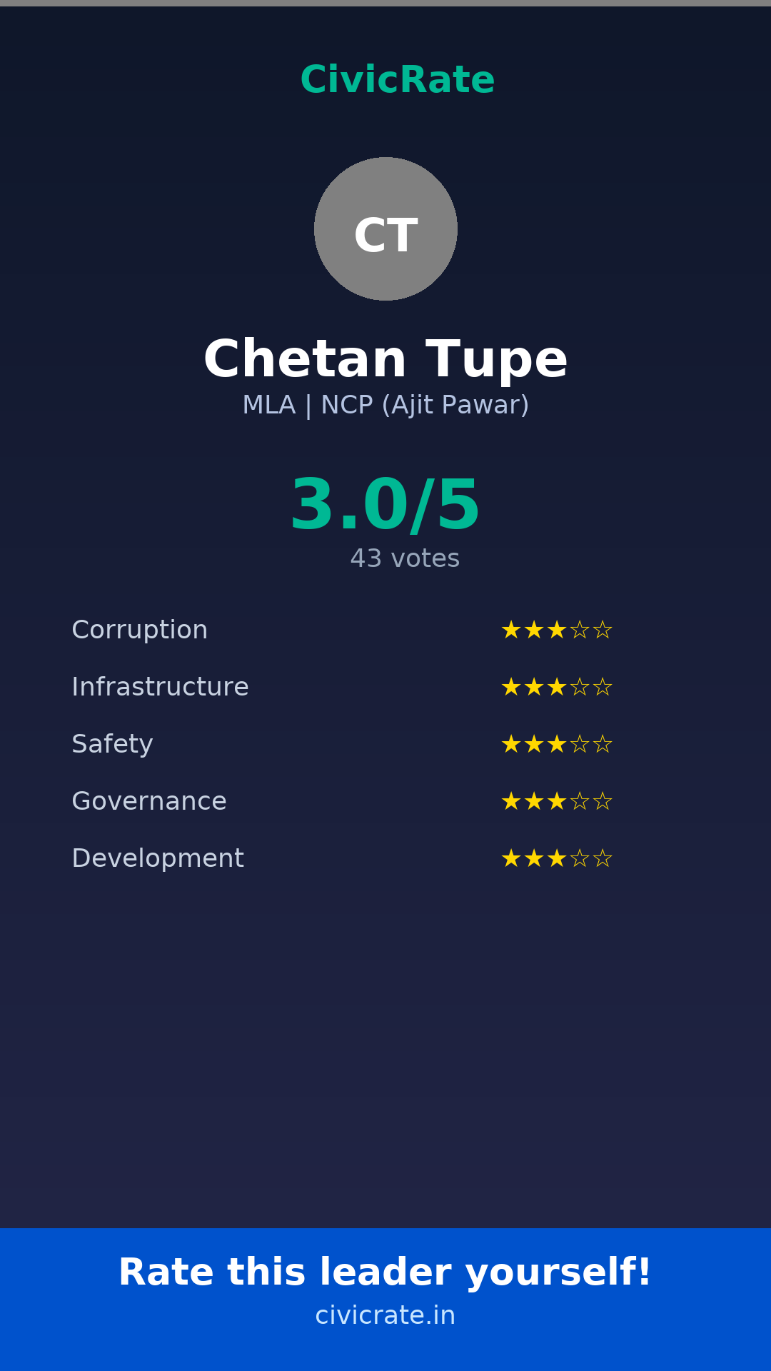 Chetan Tupe (MLA, NCP (Ajit Pawar)) has an overall citizen rating (CR Score) of 3.0/5 based on 43 anonymous votes on CivicRate. The score covers 5 parameters: Corruption Perception, Infrastructure, Safety, Governance, and Development.