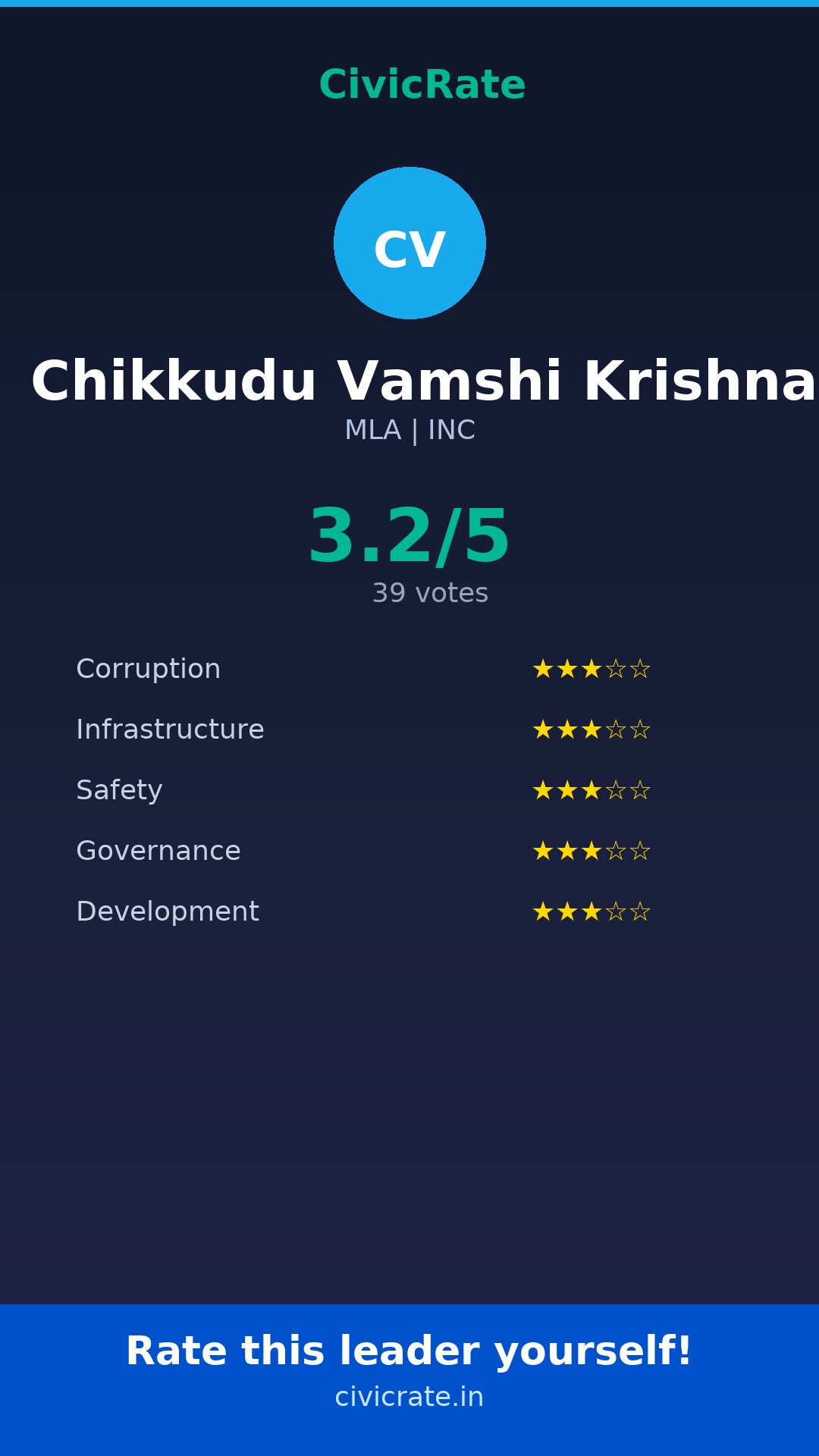 Chikkudu Vamshi Krishna (MLA, INC) has an overall citizen rating (CR Score) of 3.2/5 based on 39 anonymous votes on CivicRate. The score covers 5 parameters: Corruption Perception, Infrastructure, Safety, Governance, and Development.