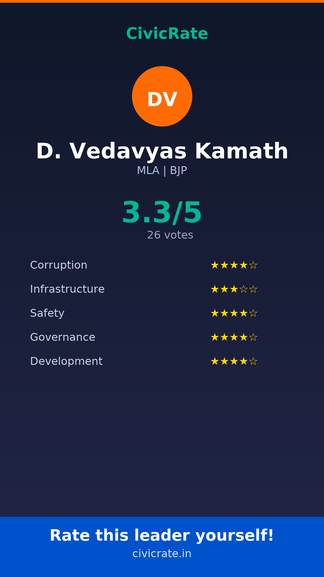 D. Vedavyas Kamath (MLA, BJP) has an overall citizen rating (CR Score) of 3.3/5 based on 26 anonymous votes on CivicRate. The score covers 5 parameters: Corruption Perception, Infrastructure, Safety, Governance, and Development.