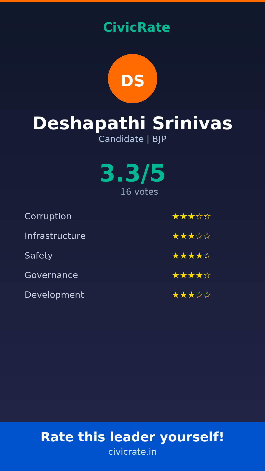 Deshapathi Srinivas (Candidate, BJP) has an overall citizen rating (CR Score) of 3.3/5 based on 16 anonymous votes on CivicRate. The score covers 5 parameters: Corruption Perception, Infrastructure, Safety, Governance, and Development.