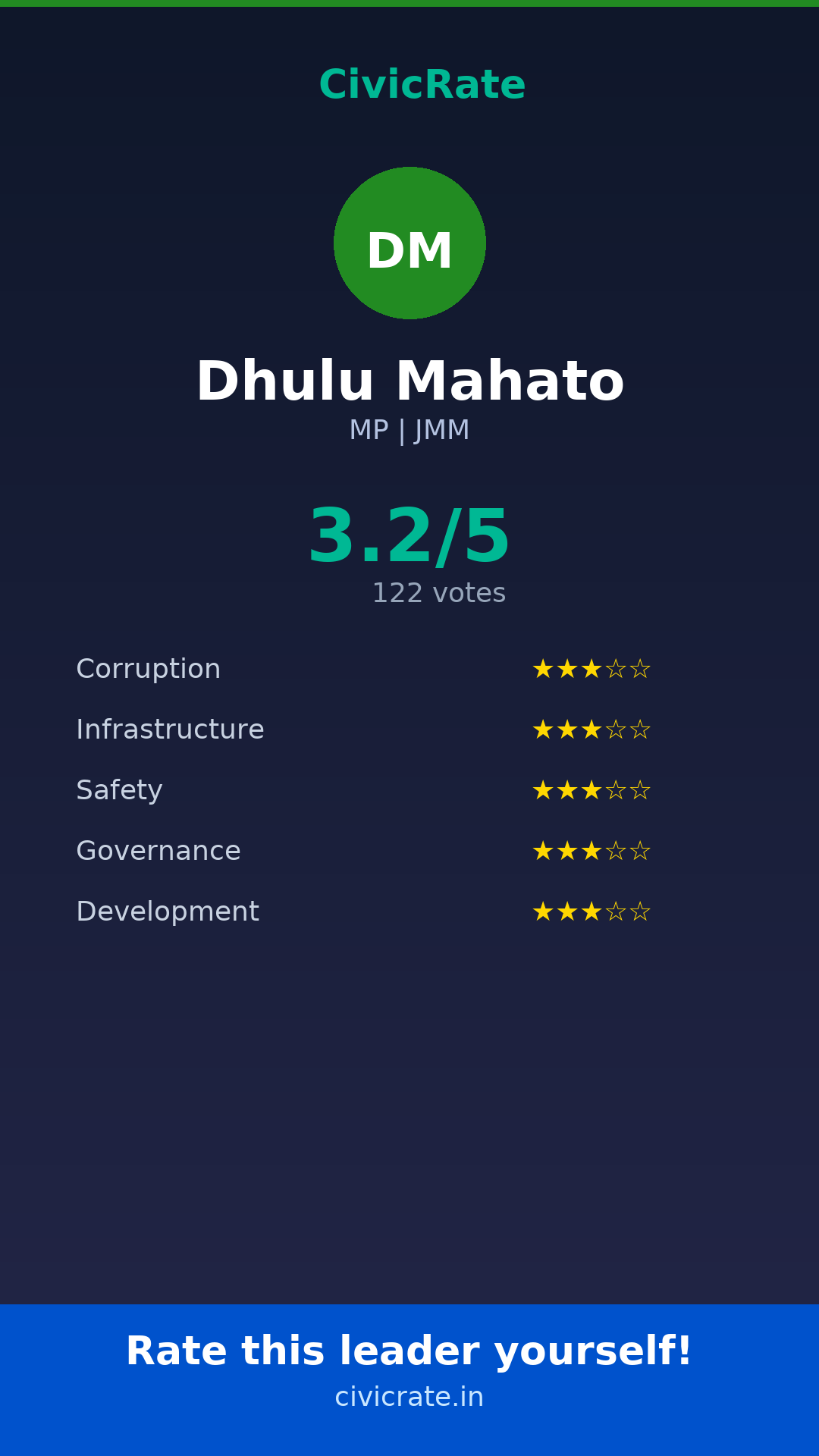 Visit civicrate.in/rate/dhulu-mahato to rate Dhulu Mahato on 5 parameters: Corruption, Infrastructure, Safety, Governance, and Development. All ratings are 100% anonymous and verified via phone OTP.