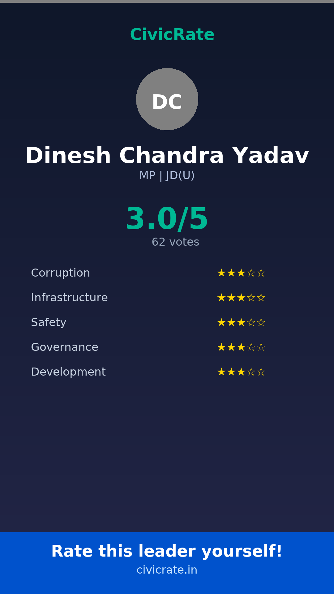 Dinesh Chandra Yadav (MP, JD(U)) has an overall citizen rating (CR Score) of 3.0/5 based on 62 anonymous votes on CivicRate. The score covers 5 parameters: Corruption Perception, Infrastructure, Safety, Governance, and Development.