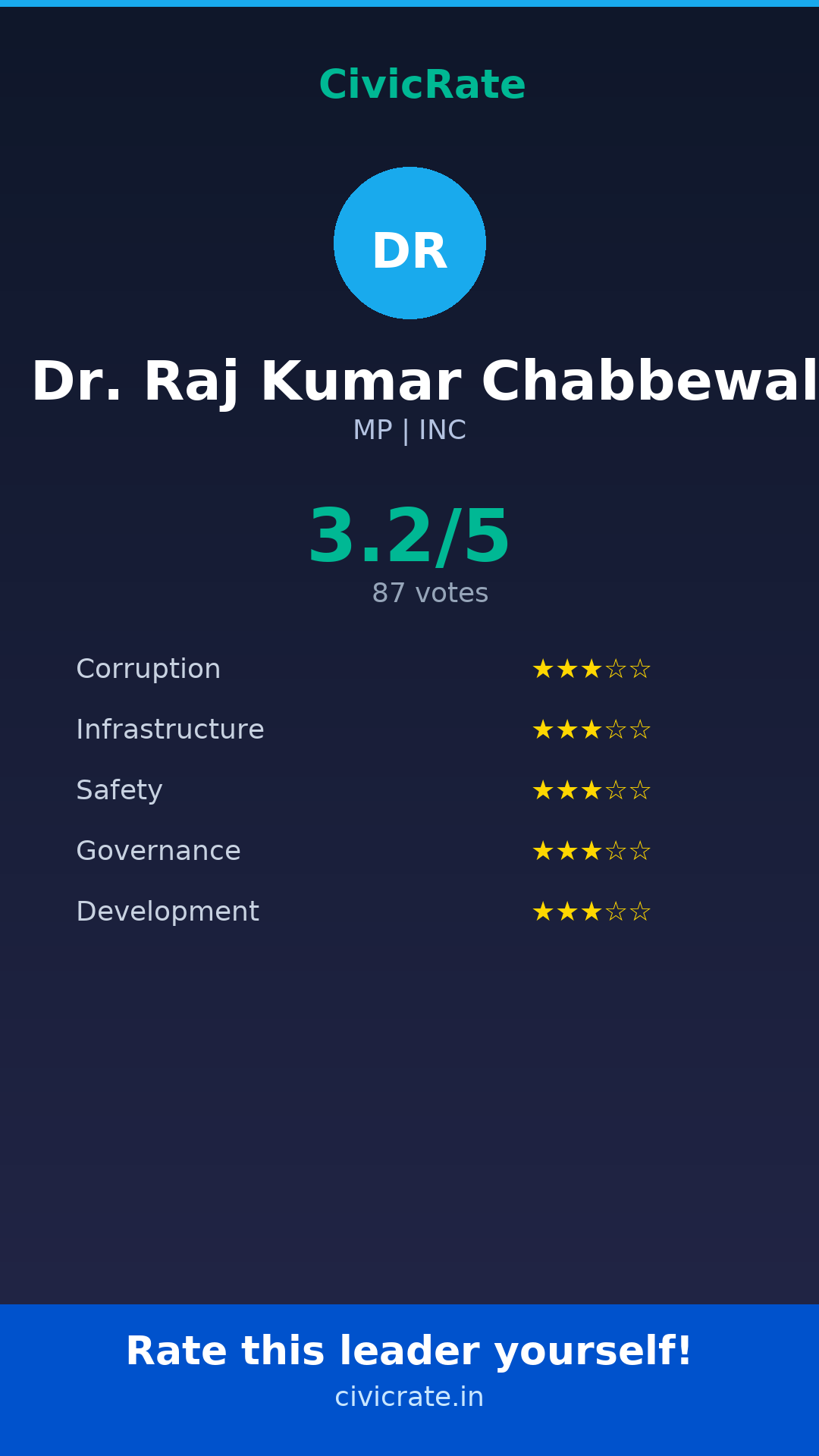 Dr. Raj Kumar Chabbewal (MP, INC) has an overall citizen rating (CR Score) of 3.2/5 based on 87 anonymous votes on CivicRate. The score covers 5 parameters: Corruption Perception, Infrastructure, Safety, Governance, and Development.
