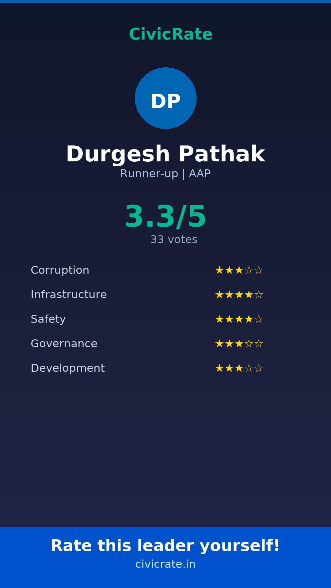 Durgesh Pathak (Runner-up, AAP) has an overall citizen rating (CR Score) of 3.3/5 based on 33 anonymous votes on CivicRate. The score covers 5 parameters: Corruption Perception, Infrastructure, Safety, Governance, and Development.
