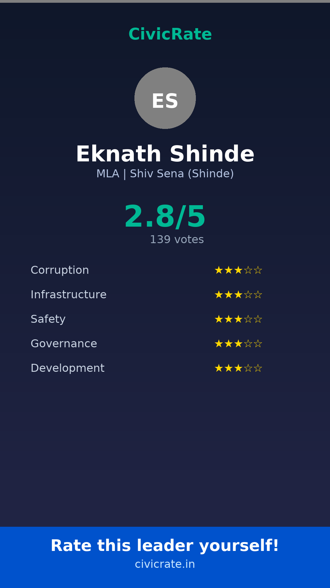 Eknath Shinde (MLA, Shiv Sena (Shinde)) has an overall citizen rating (CR Score) of 2.8/5 based on 139 anonymous votes on CivicRate. The score covers 5 parameters: Corruption Perception, Infrastructure, Safety, Governance, and Development.