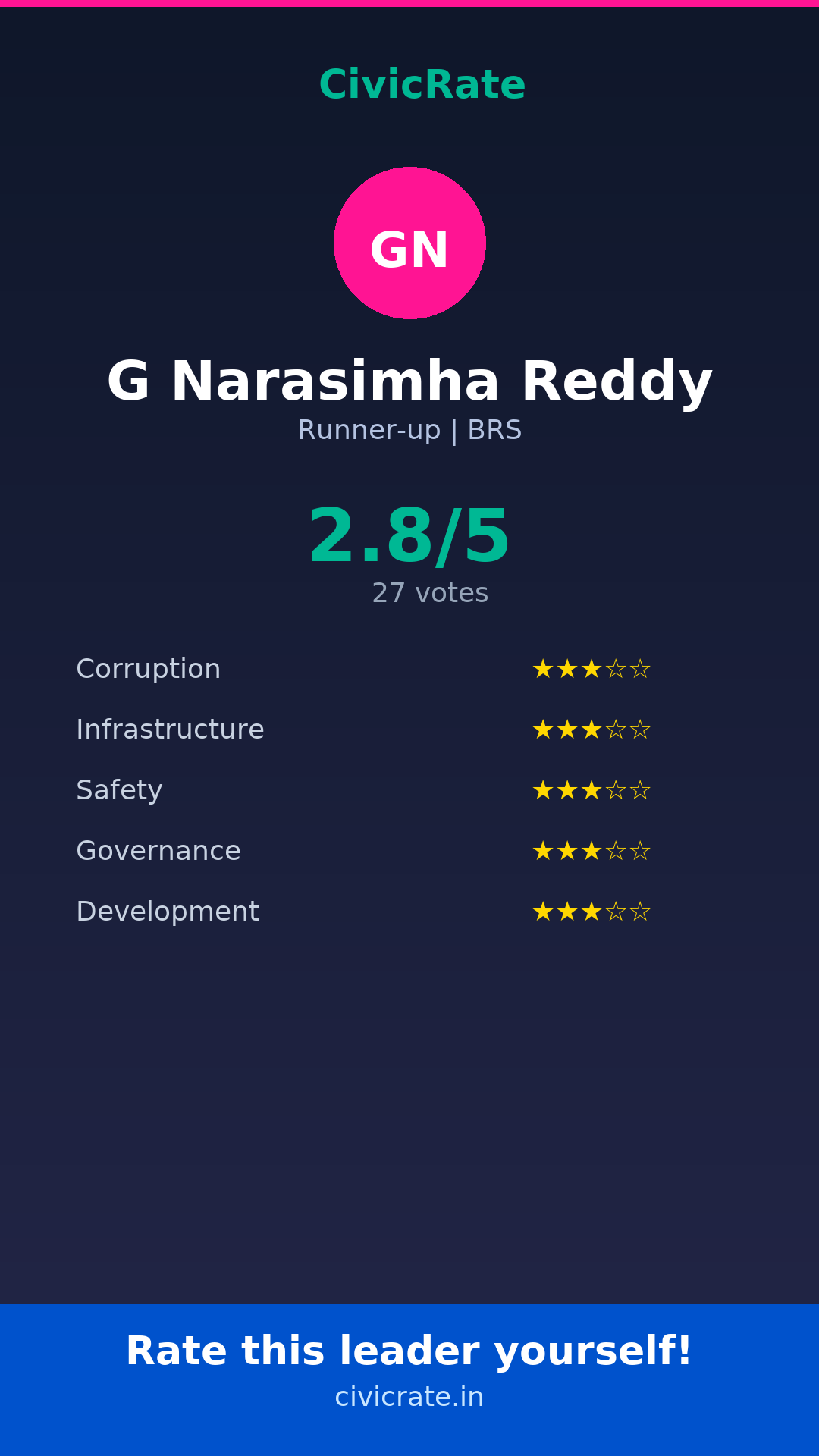 G Narasimha Reddy (Runner-up, BRS) has an overall citizen rating (CR Score) of 2.8/5 based on 27 anonymous votes on CivicRate. The score covers 5 parameters: Corruption Perception, Infrastructure, Safety, Governance, and Development.