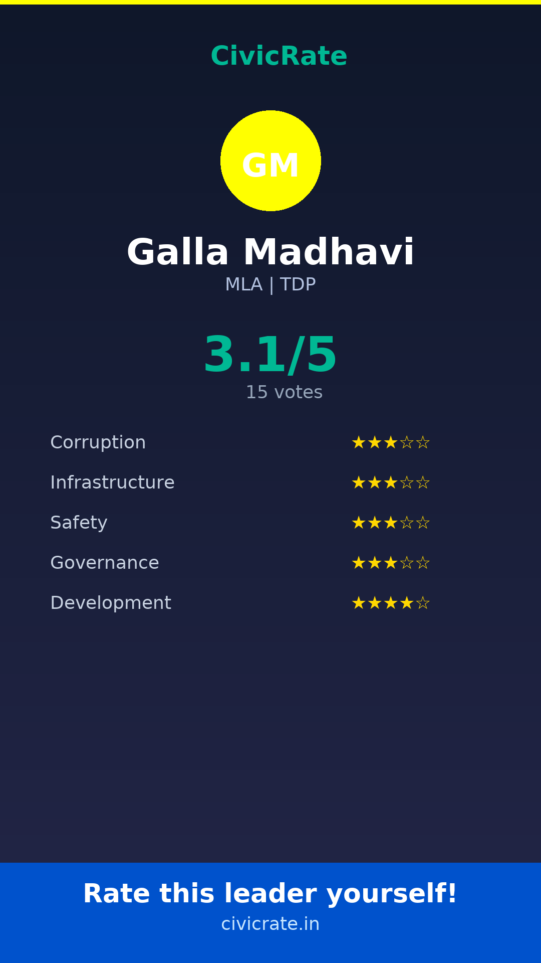 Visit civicrate.in/rate/galla-madhavi to rate Galla Madhavi on 5 parameters: Corruption, Infrastructure, Safety, Governance, and Development. All ratings are 100% anonymous and verified via phone OTP.