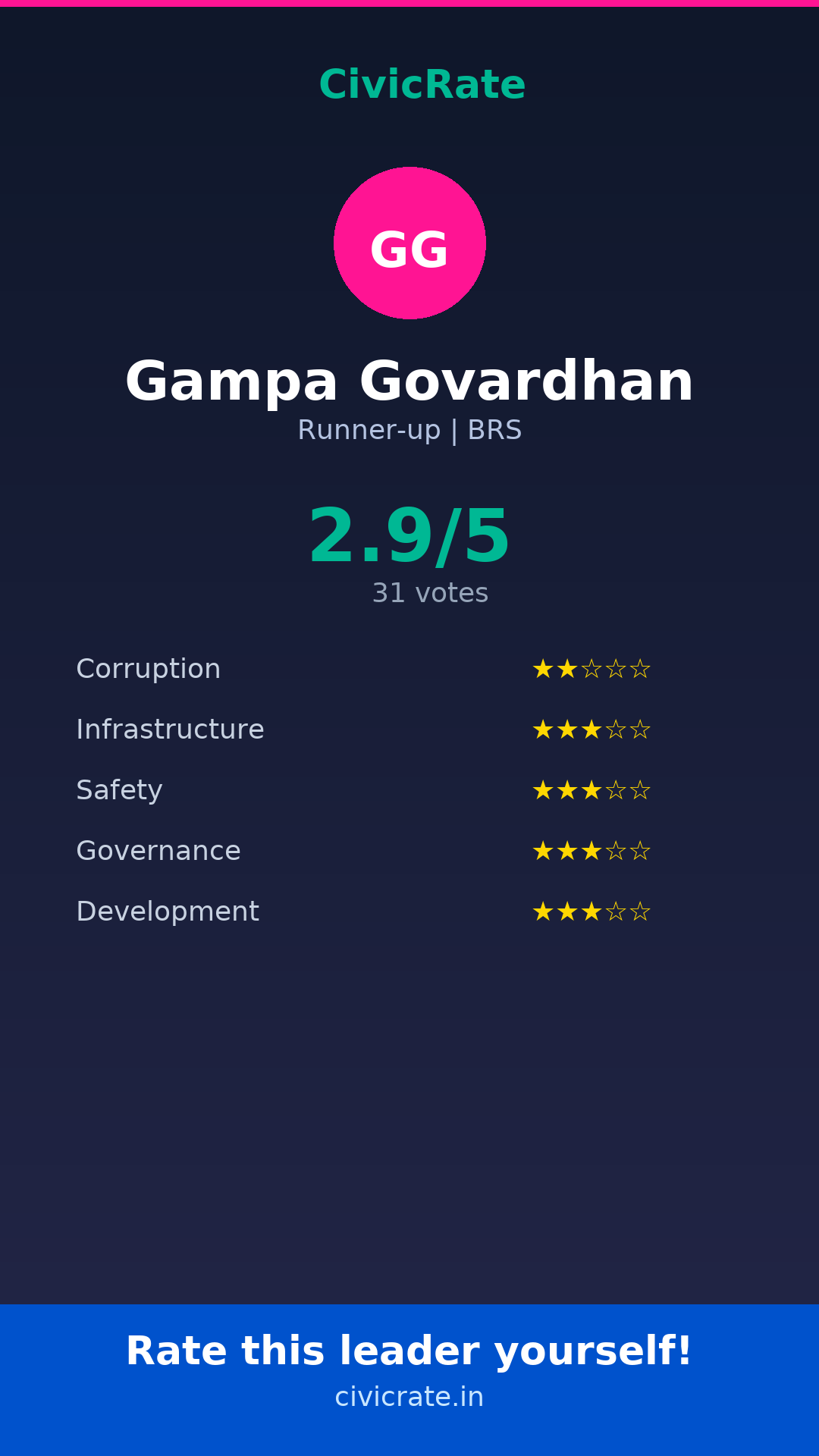 Gampa Govardhan (Runner-up, BRS) has an overall citizen rating (CR Score) of 2.9/5 based on 31 anonymous votes on CivicRate. The score covers 5 parameters: Corruption Perception, Infrastructure, Safety, Governance, and Development.
