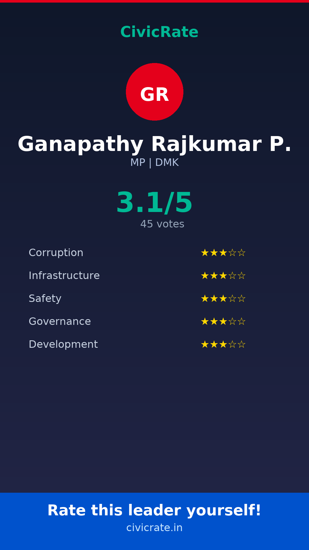 Ganapathy Rajkumar P. (MP, DMK) has an overall citizen rating (CR Score) of 3.1/5 based on 45 anonymous votes on CivicRate. The score covers 5 parameters: Corruption Perception, Infrastructure, Safety, Governance, and Development.