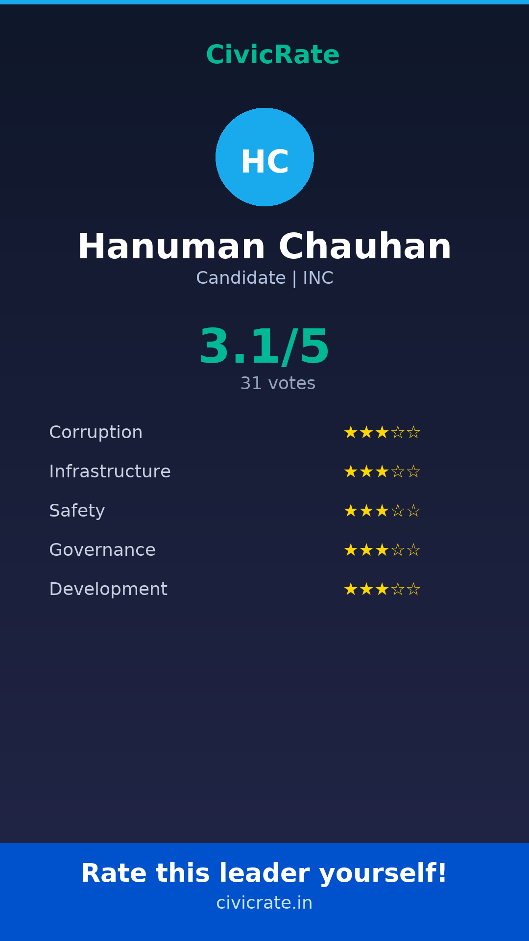Hanuman Chauhan (Candidate, INC) has an overall citizen rating (CR Score) of 3.1/5 based on 31 anonymous votes on CivicRate. The score covers 5 parameters: Corruption Perception, Infrastructure, Safety, Governance, and Development.