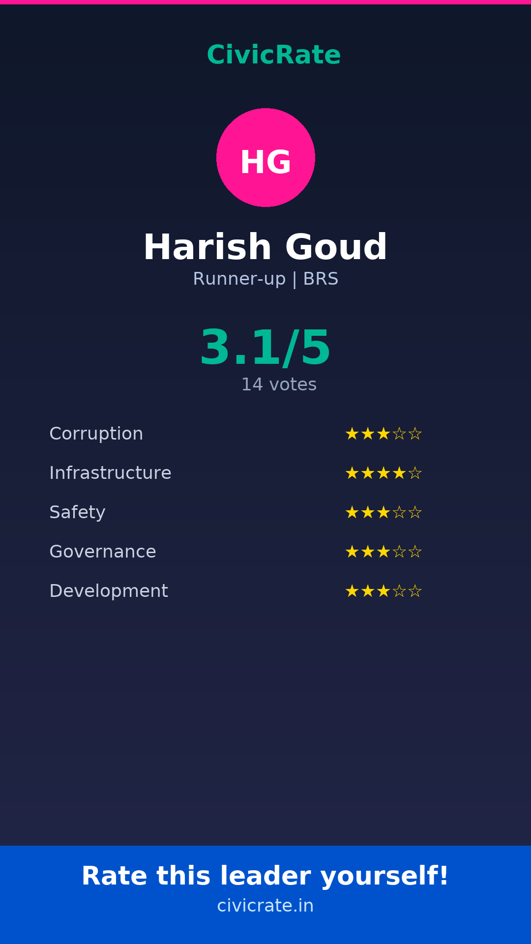 Harish Goud (Runner-up, BRS) has an overall citizen rating (CR Score) of 3.1/5 based on 14 anonymous votes on CivicRate. The score covers 5 parameters: Corruption Perception, Infrastructure, Safety, Governance, and Development.