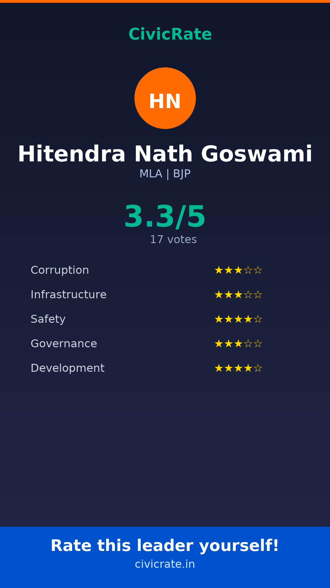 Visit civicrate.in/rate/hitendra-nath-goswami to rate Hitendra Nath Goswami on 5 parameters: Corruption, Infrastructure, Safety, Governance, and Development. All ratings are 100% anonymous and verified via phone OTP.