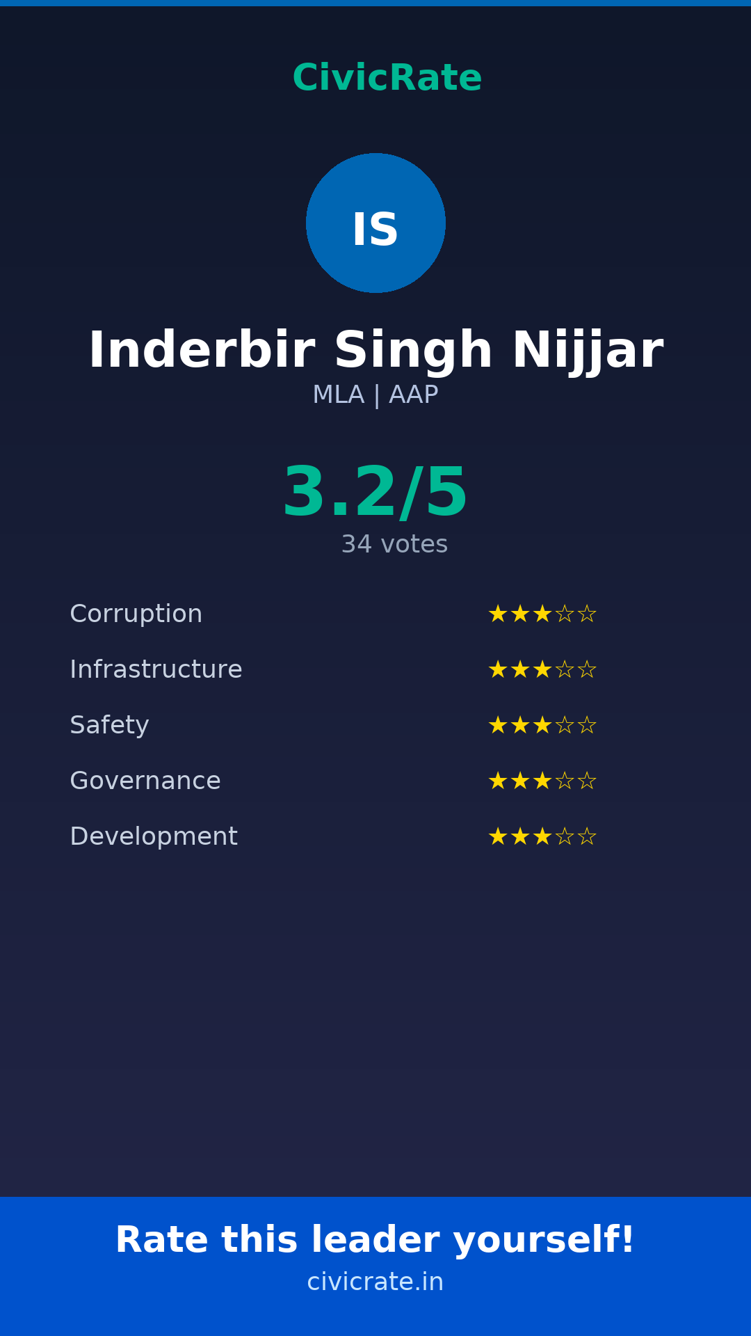 Inderbir Singh Nijjar (MLA, AAP) has an overall citizen rating (CR Score) of 3.2/5 based on 34 anonymous votes on CivicRate. The score covers 5 parameters: Corruption Perception, Infrastructure, Safety, Governance, and Development.
