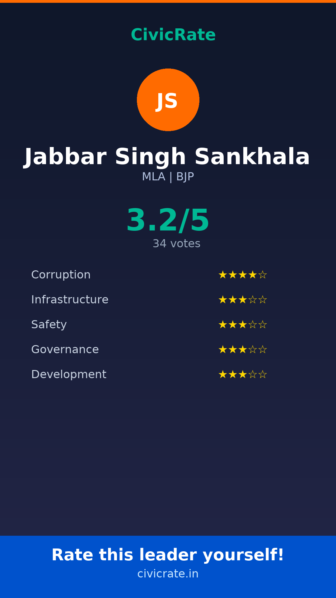 Jabbar Singh Sankhala (MLA, BJP) has an overall citizen rating (CR Score) of 3.2/5 based on 34 anonymous votes on CivicRate. The score covers 5 parameters: Corruption Perception, Infrastructure, Safety, Governance, and Development.