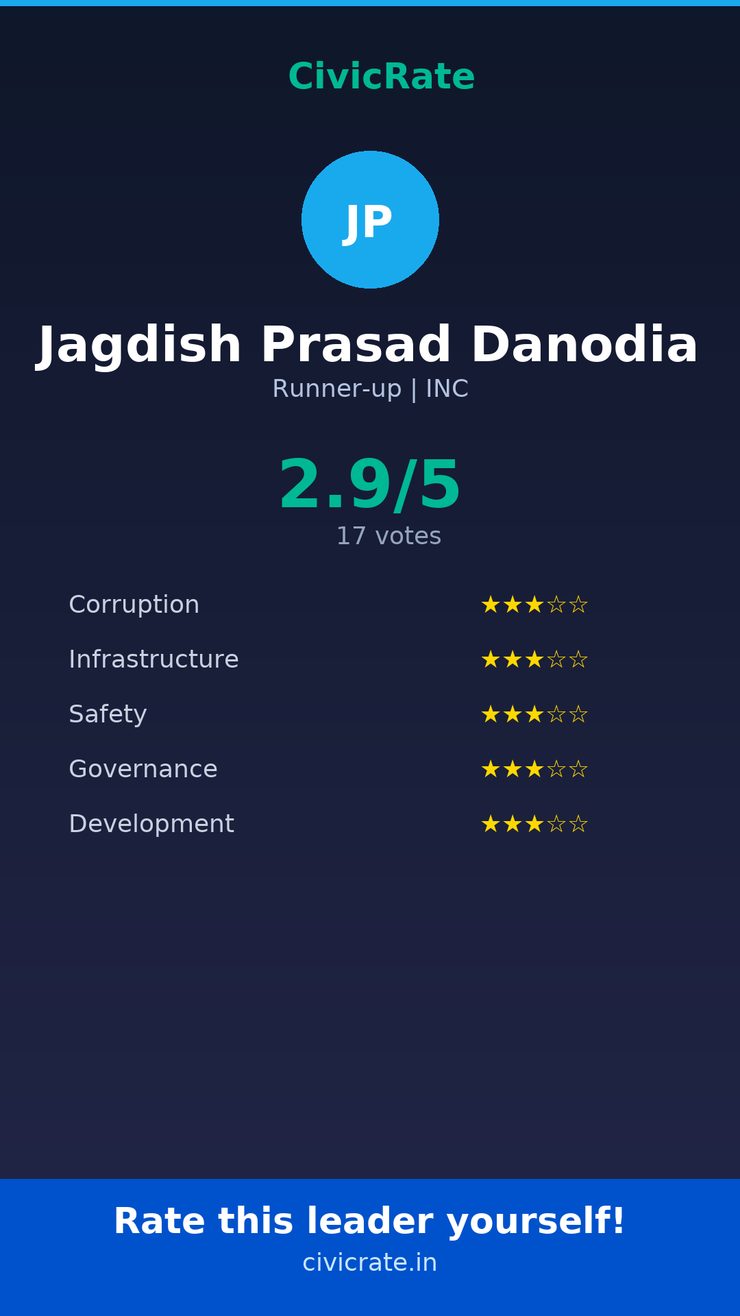 Jagdish Prasad Danodia (Runner-up, INC) has an overall citizen rating (CR Score) of 2.9/5 based on 17 anonymous votes on CivicRate. The score covers 5 parameters: Corruption Perception, Infrastructure, Safety, Governance, and Development.