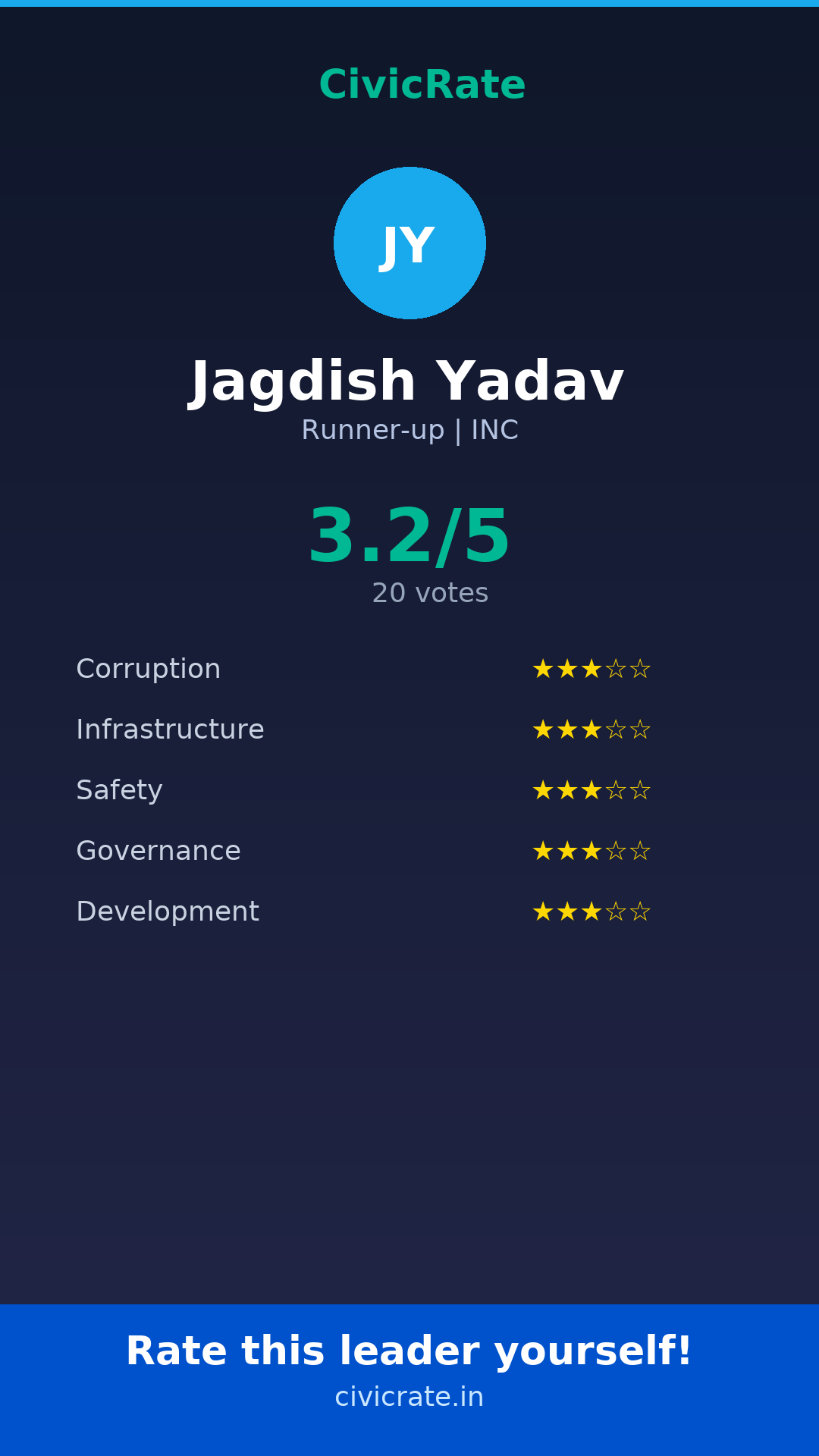 Jagdish Yadav (Runner-up, INC) has an overall citizen rating (CR Score) of 3.2/5 based on 20 anonymous votes on CivicRate. The score covers 5 parameters: Corruption Perception, Infrastructure, Safety, Governance, and Development.