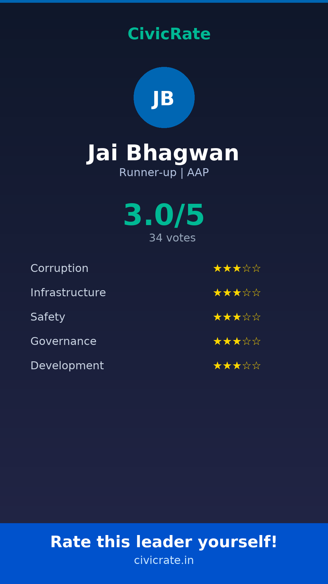 Jai Bhagwan (Runner-up, AAP) has an overall citizen rating (CR Score) of 3.0/5 based on 34 anonymous votes on CivicRate. The score covers 5 parameters: Corruption Perception, Infrastructure, Safety, Governance, and Development.