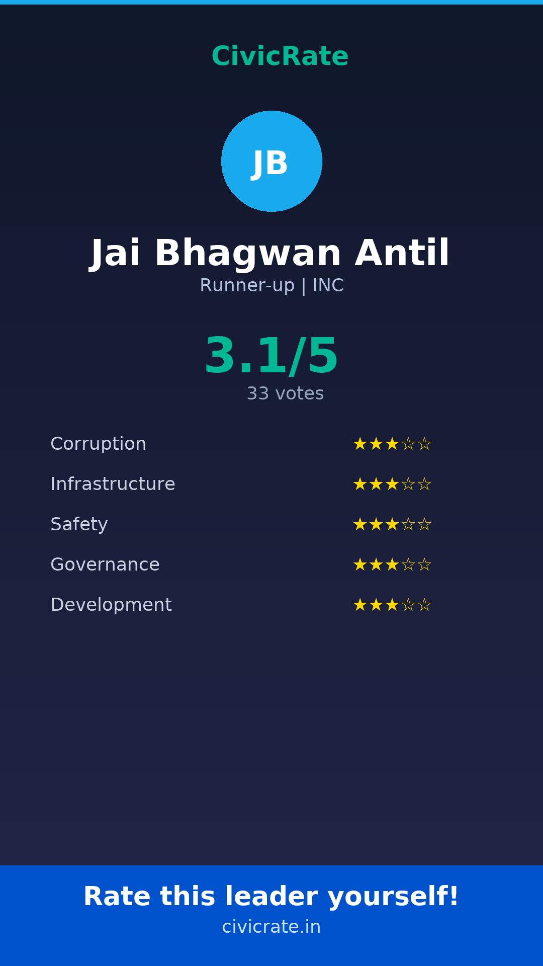 Jai Bhagwan Antil (Runner-up, INC) has an overall citizen rating (CR Score) of 3.1/5 based on 33 anonymous votes on CivicRate. The score covers 5 parameters: Corruption Perception, Infrastructure, Safety, Governance, and Development.