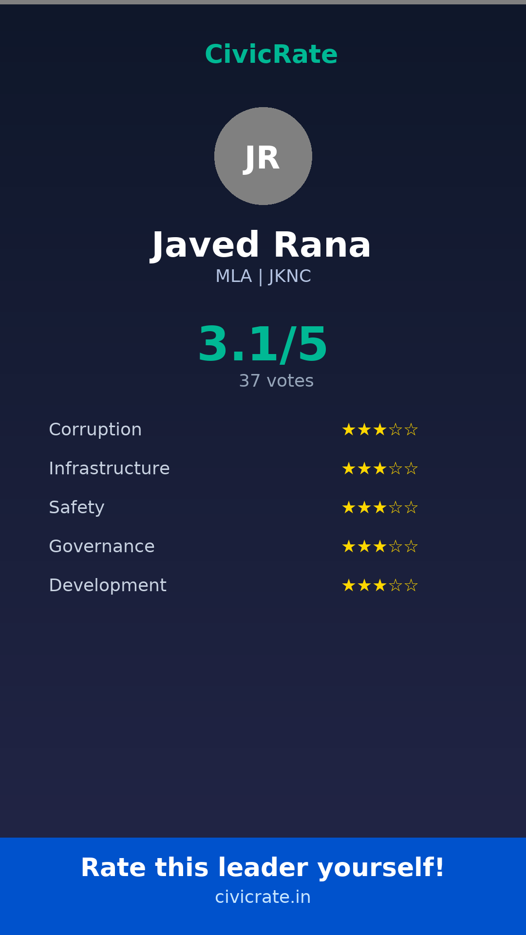 Javed Rana (MLA, JKNC) has an overall citizen rating (CR Score) of 3.1/5 based on 37 anonymous votes on CivicRate. The score covers 5 parameters: Corruption Perception, Infrastructure, Safety, Governance, and Development.