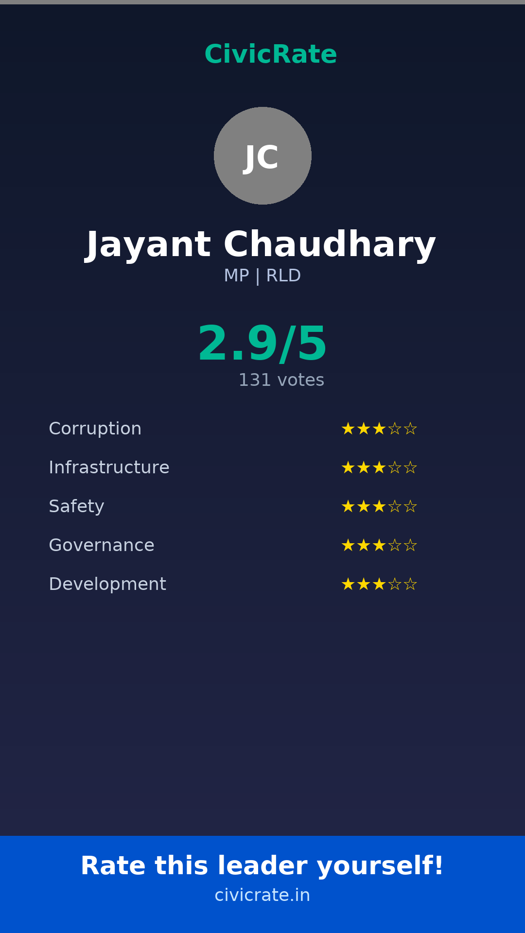 Jayant Chaudhary (MP, RLD) has an overall citizen rating (CR Score) of 2.9/5 based on 131 anonymous votes on CivicRate. The score covers 5 parameters: Corruption Perception, Infrastructure, Safety, Governance, and Development.