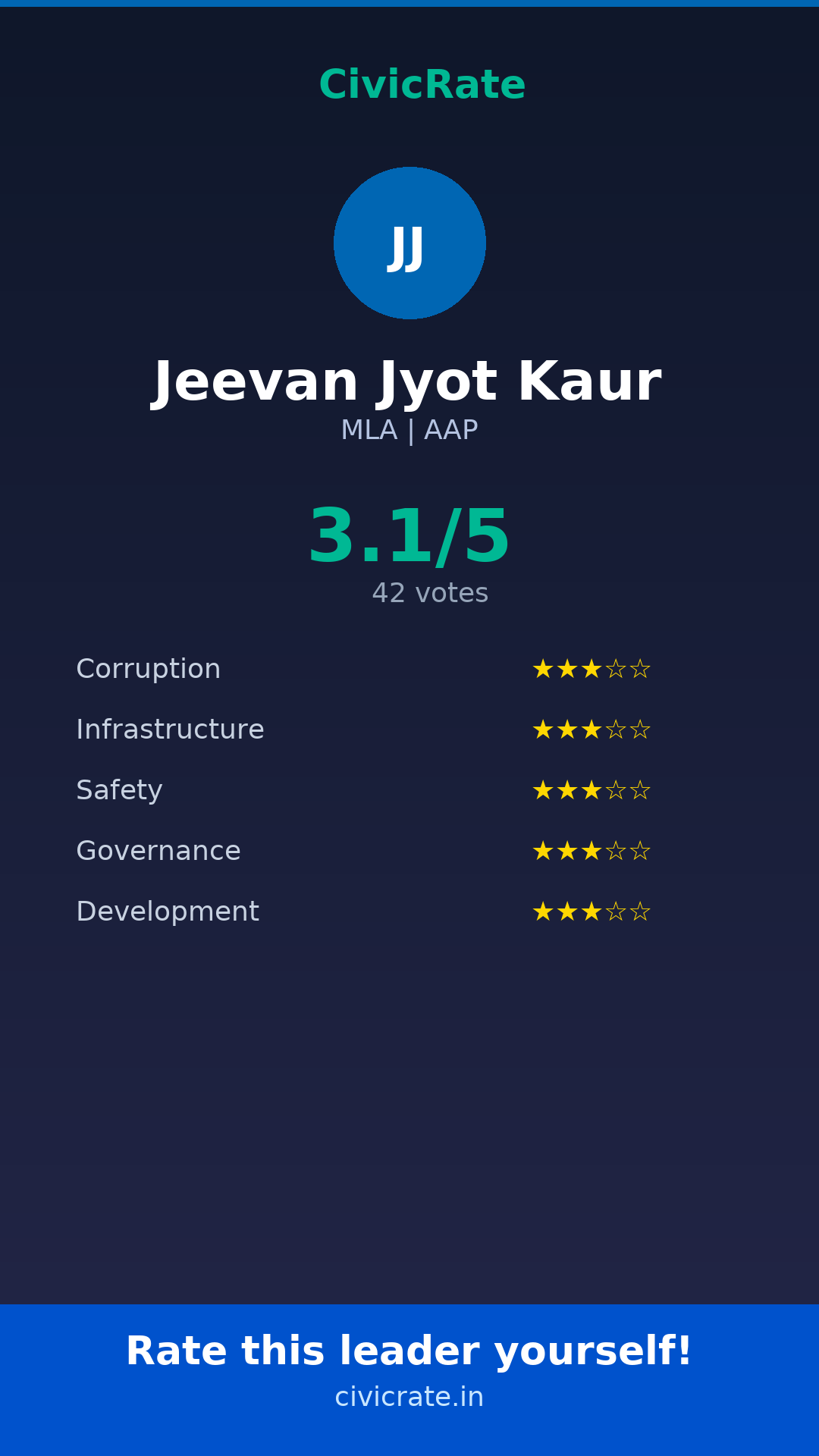Jeevan Jyot Kaur (MLA, AAP) has an overall citizen rating (CR Score) of 3.1/5 based on 42 anonymous votes on CivicRate. The score covers 5 parameters: Corruption Perception, Infrastructure, Safety, Governance, and Development.