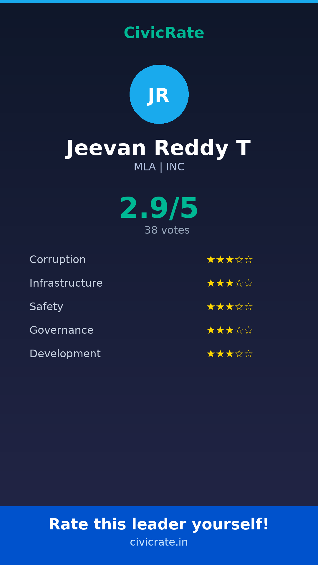 Jeevan Reddy T (MLA, INC) has an overall citizen rating (CR Score) of 2.9/5 based on 38 anonymous votes on CivicRate. The score covers 5 parameters: Corruption Perception, Infrastructure, Safety, Governance, and Development.