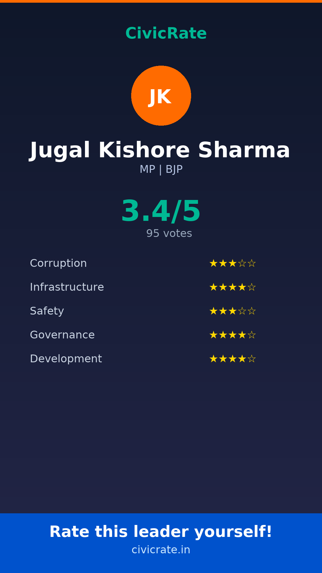 Jugal Kishore Sharma (MP, BJP) has an overall citizen rating (CR Score) of 3.4/5 based on 95 anonymous votes on CivicRate. The score covers 5 parameters: Corruption Perception, Infrastructure, Safety, Governance, and Development.