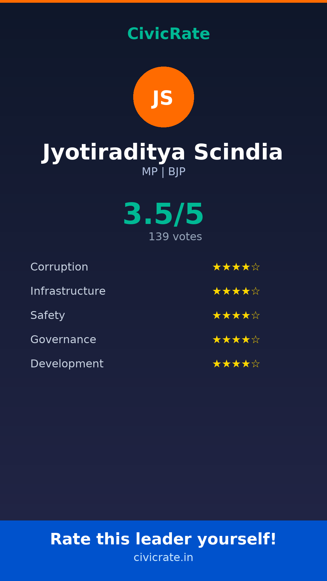 Jyotiraditya Scindia (MP, BJP) has an overall citizen rating (CR Score) of 3.5/5 based on 139 anonymous votes on CivicRate. The score covers 5 parameters: Corruption Perception, Infrastructure, Safety, Governance, and Development.
