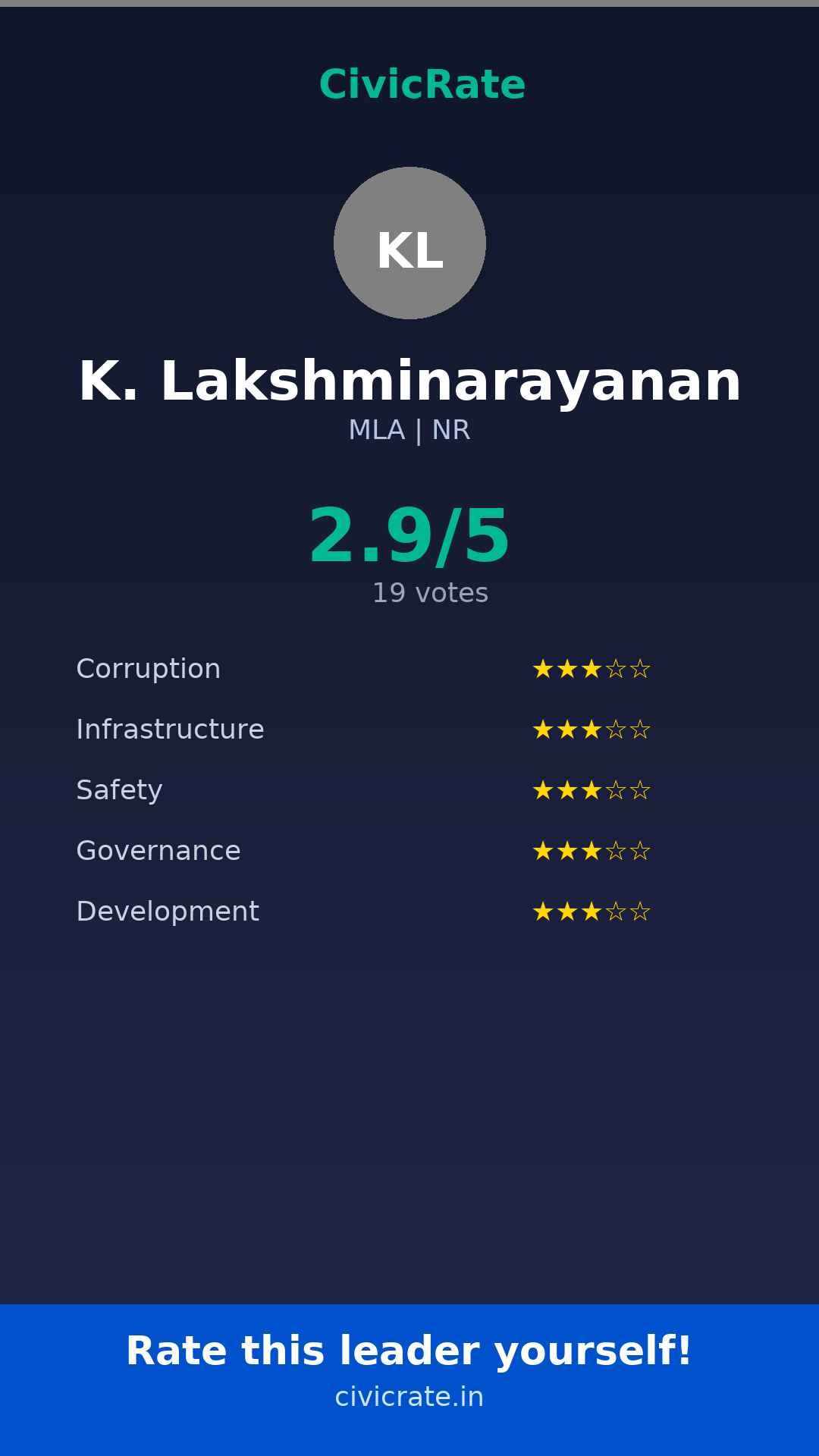K. Lakshminarayanan (MLA, NR) has an overall citizen rating (CR Score) of 2.9/5 based on 19 anonymous votes on CivicRate. The score covers 5 parameters: Corruption Perception, Infrastructure, Safety, Governance, and Development.